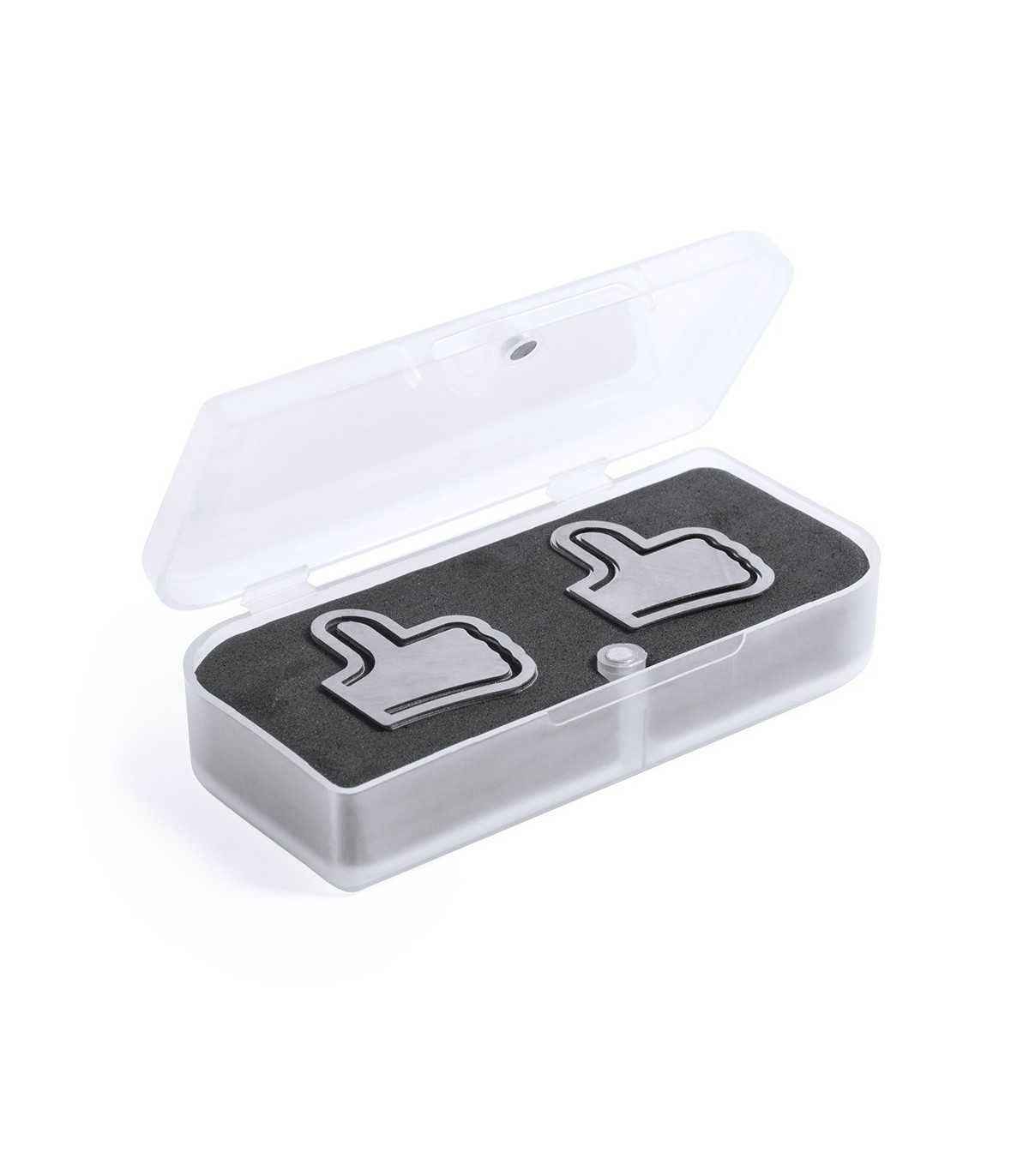 Set de 20 clips en diseño OK. Presentados en estuche individual de PVC translúcido con cierre magnético e interior troquelado en suave espuma.