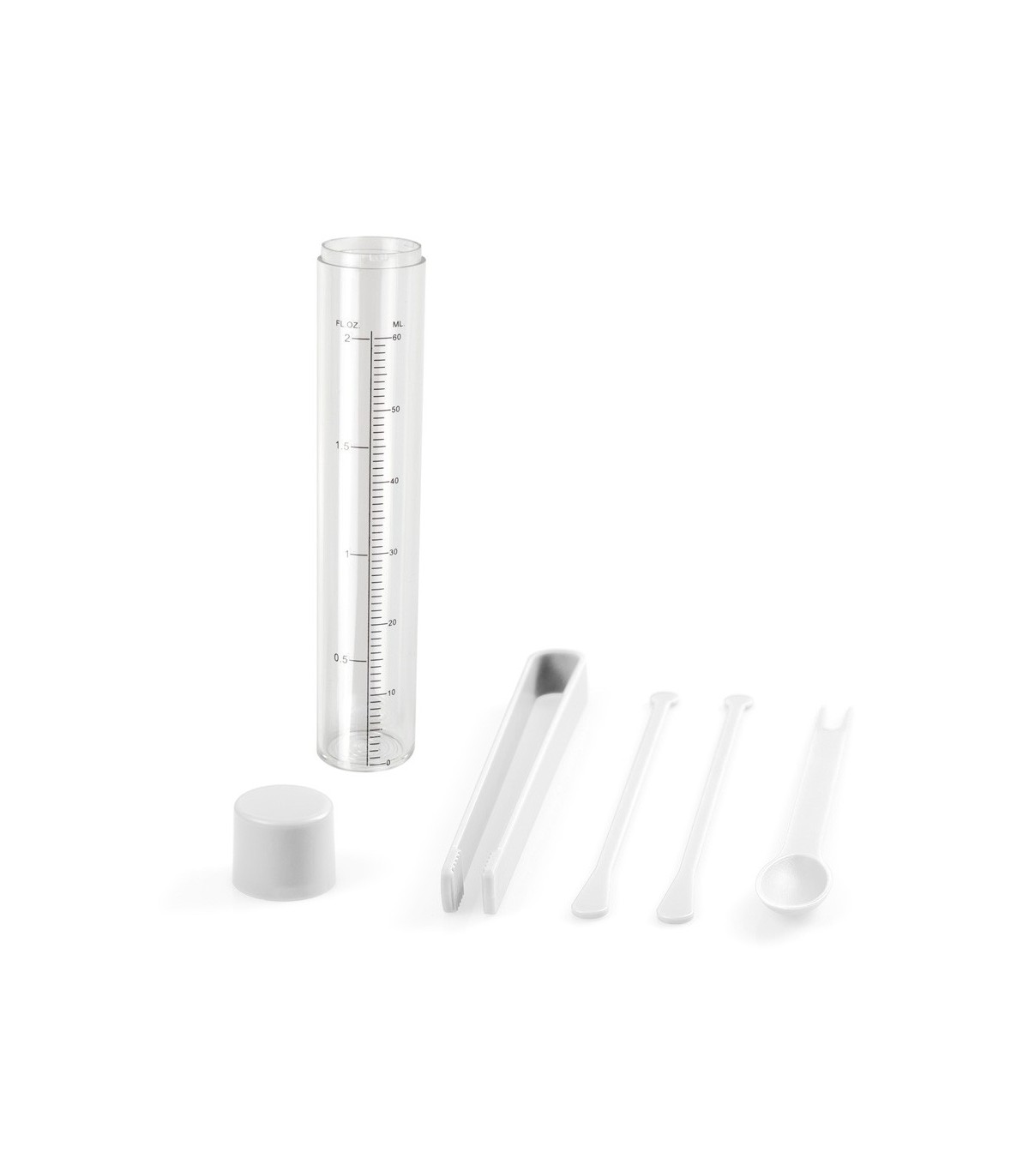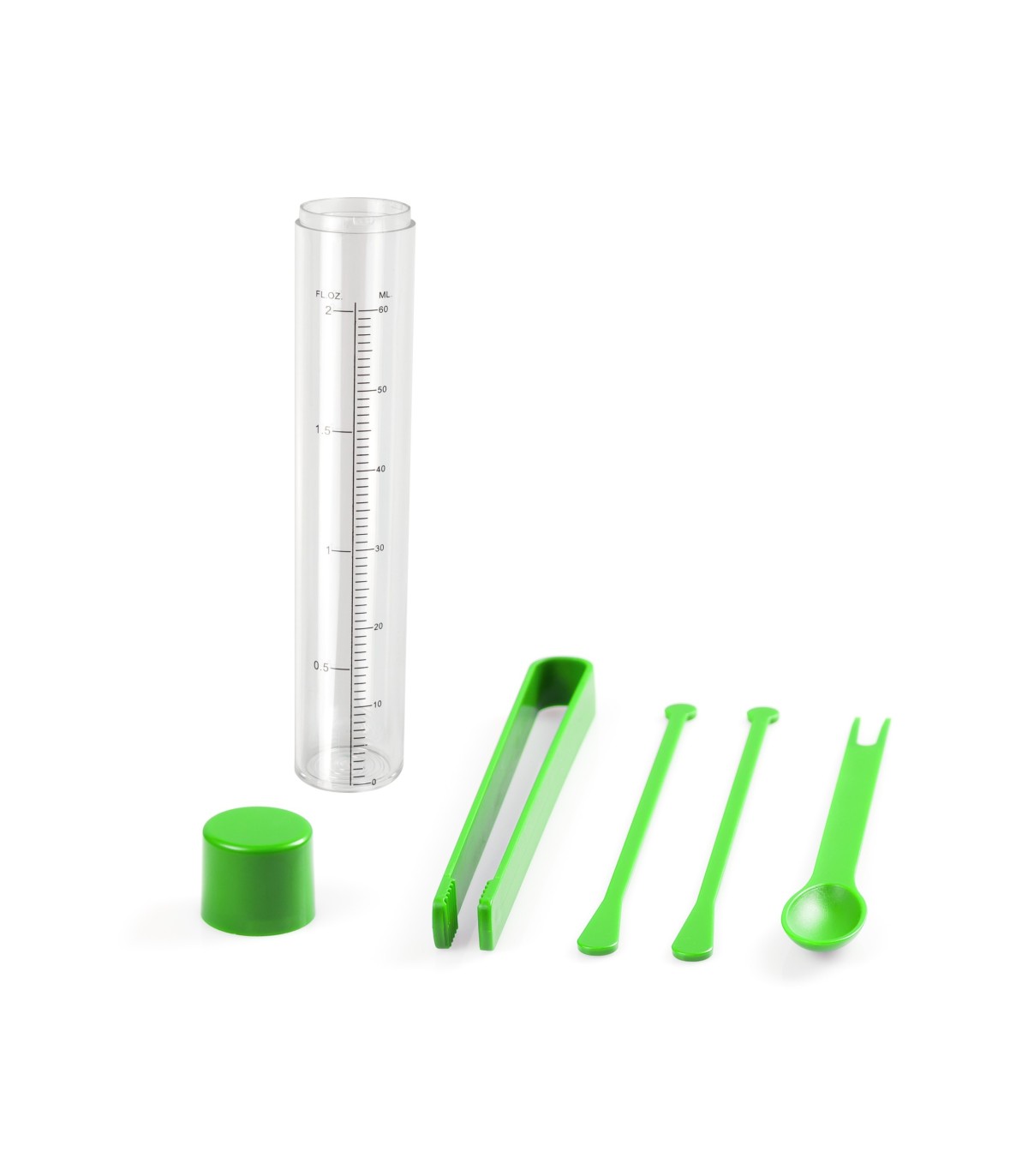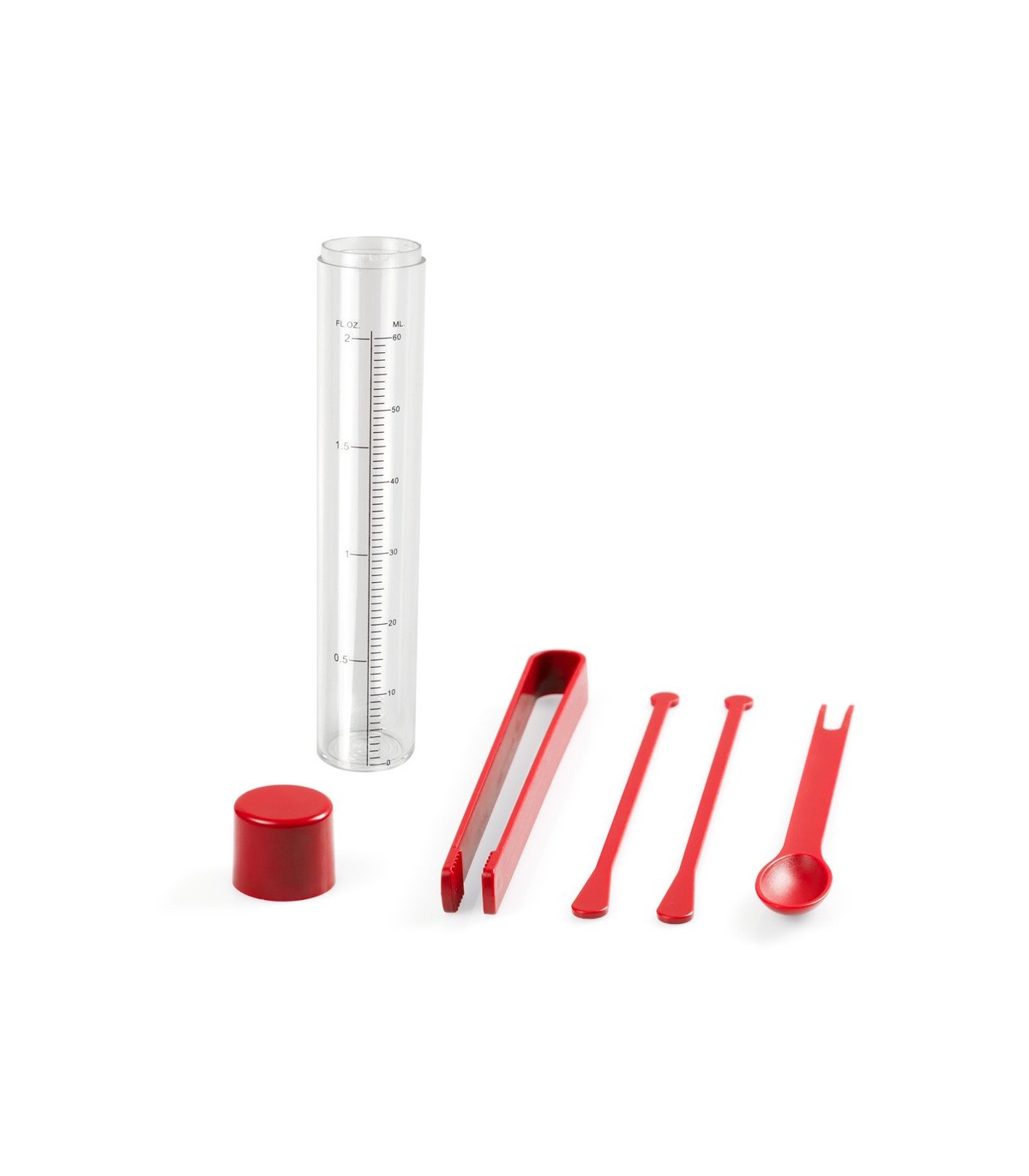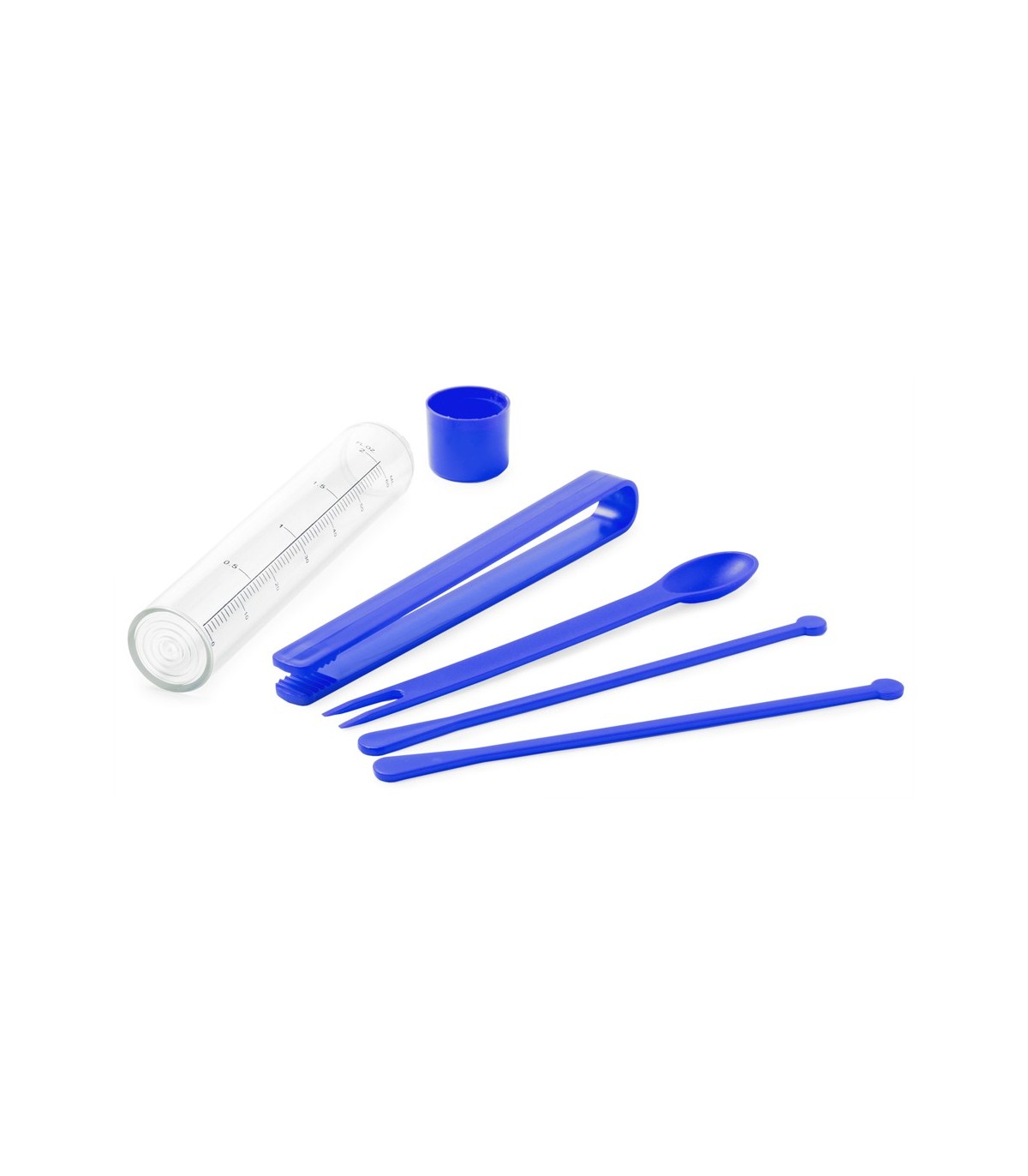 Set para cocktails de 5 accesorios en varios colores originales para imprimir. Incluye envase medidor de 60ml de capacidad, cuchara trinchador, pinzas y dos agitadores.