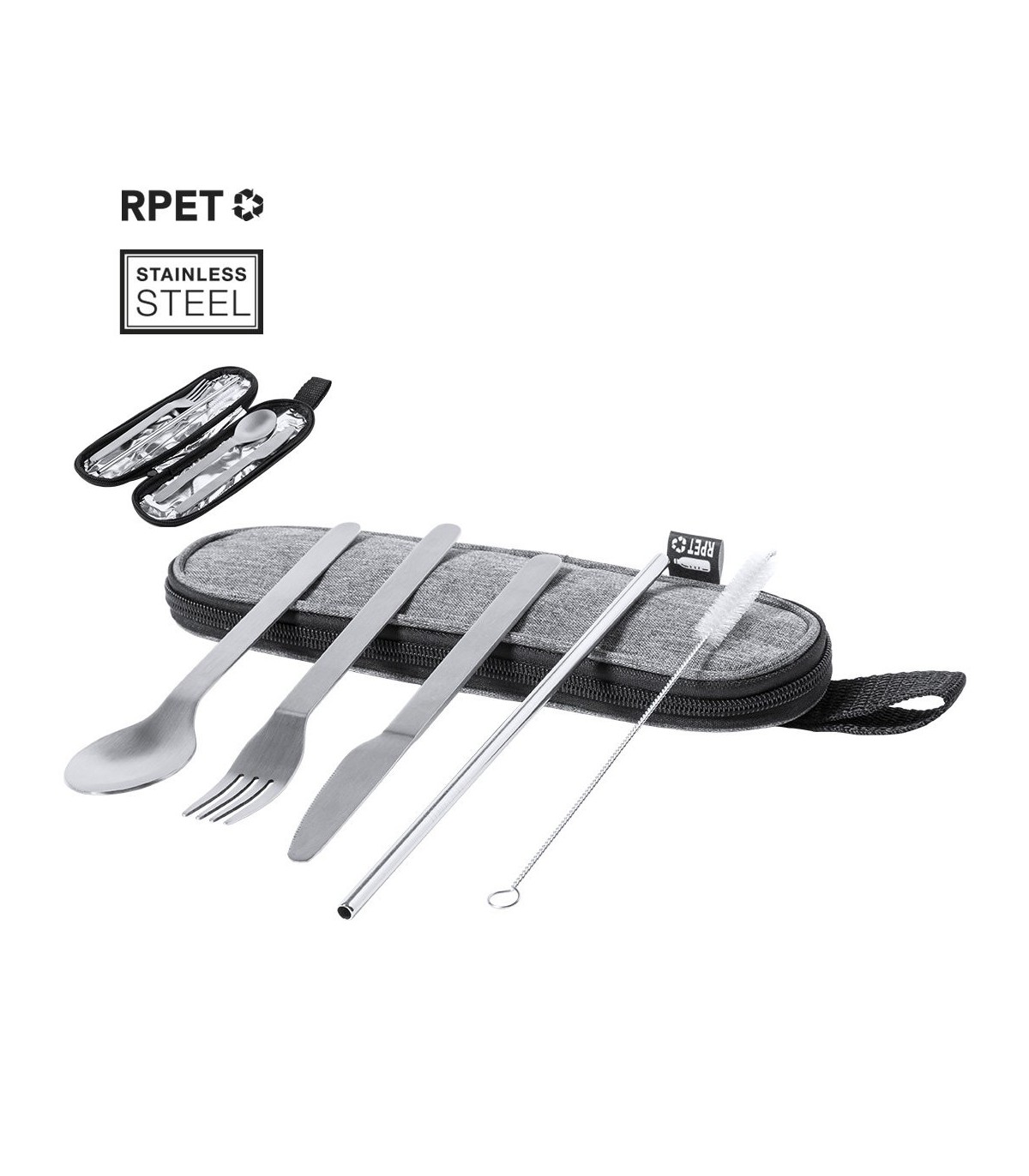 Set de cubiertos reutilizables elaborados en resistente y duradero acero inox. Incluye cuchara, cuchillo, tenedor, pajita y accesorio de limpieza. Presentados en elegante estuche individual de poliéster 300D RPET, elaborado a partir de plástico reciclado para así fomentar la reutilización de residuos plásticos y ayudar a la sostenibilidad del planeta. Estuche con cinta de transporte, cierre de cremallera y distintivo RPET en etiqueta.
