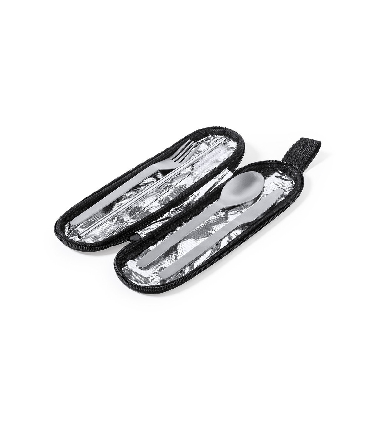 Set de cubiertos reutilizables en acero inox. Incluye cuchara, cuchillo, tenedor, pajita y accesorio de limpieza. Estuche con cinta de transporte, cierre de cremallera.