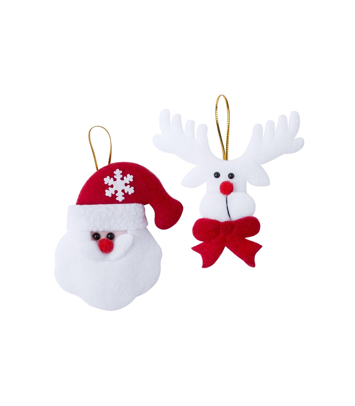 Set de adornos navideños de 2 piezas en suave poliéster. Incluye Papá Noel y reno con pajarita para colgar. Presentado en bolsita individual con banda en color blanco para marcaje.