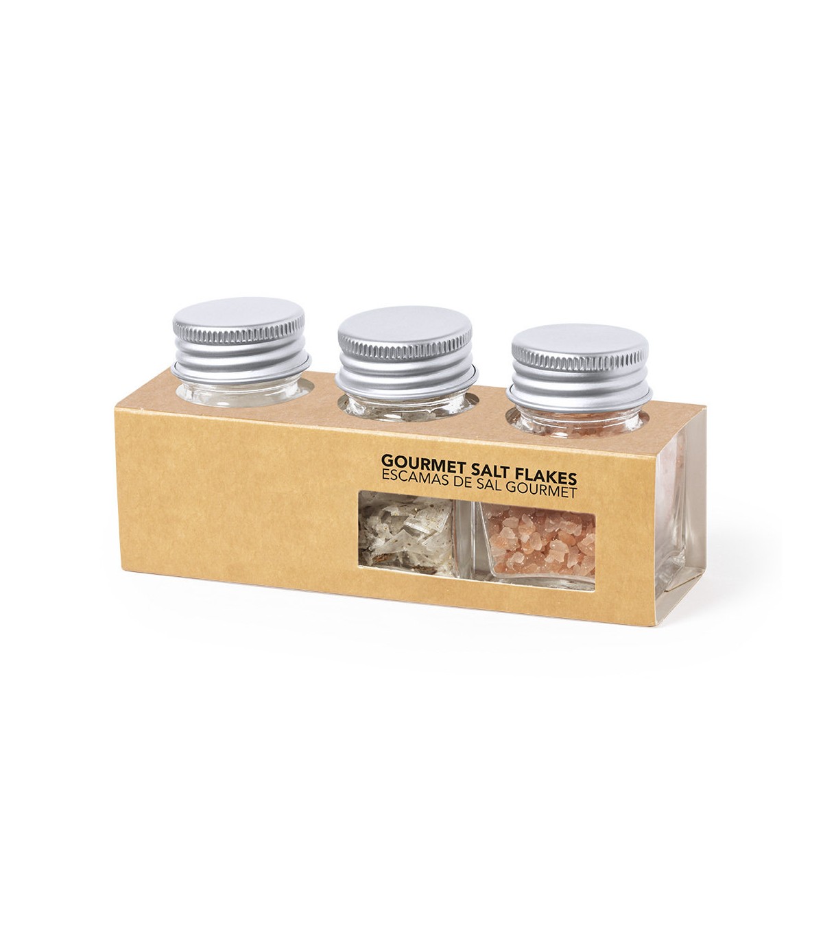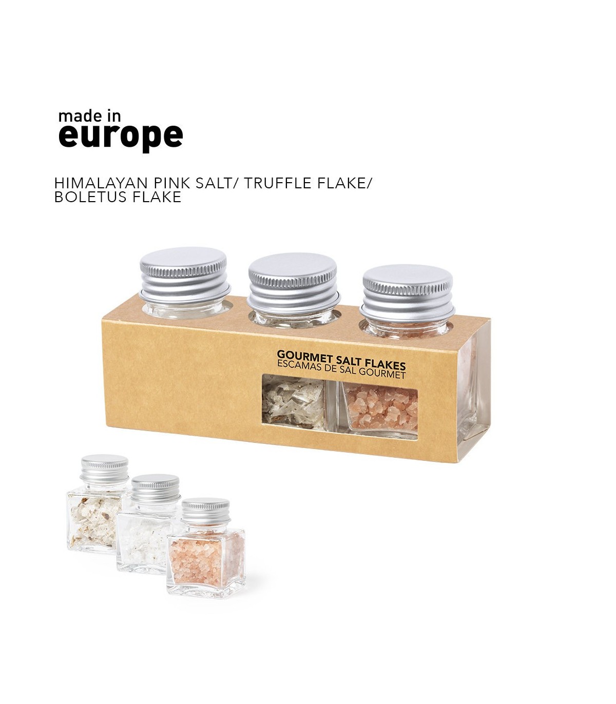 Set de 3 tarros de sales gourmet, sal rosa del Himalaya, escamas de sal de trufa y escamas de sal boletus. De fabricación europea, hechos en cristal con tapón a rosca metálico. Set presentado en estuche de cartón con ventana.