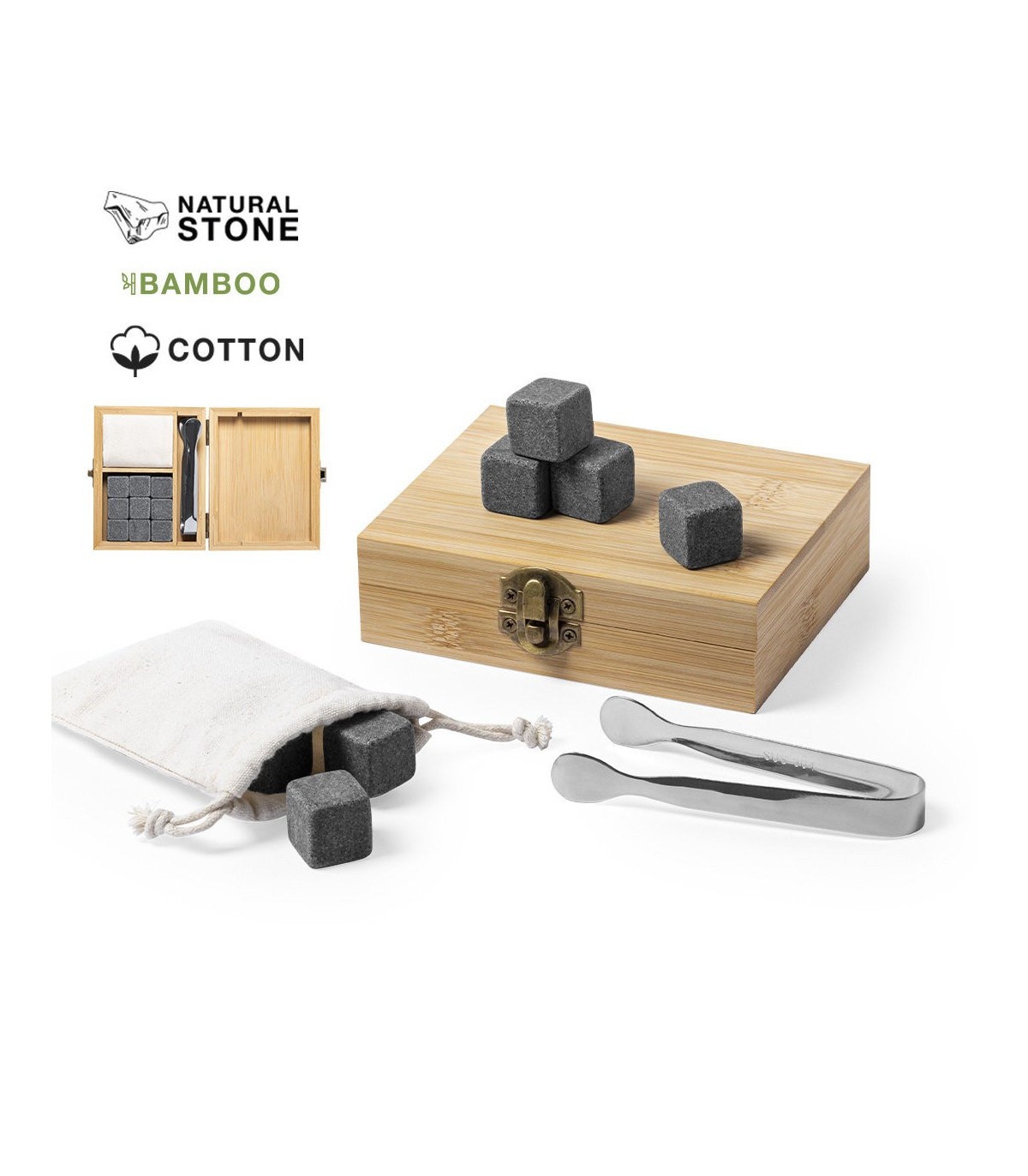 Set de 9 cubitos reutilizables. elaborados en piedra natural esteatita, también conocida como piedra o roca de jabón, que mantiene la bebida fría sin alterar sus propiedades al no diluir su contenido en agua, además de mantener el sabor original de la misma. Incluye pinzas de acero inoxidable y funda de algodón. Presentado en estuche de bambú.