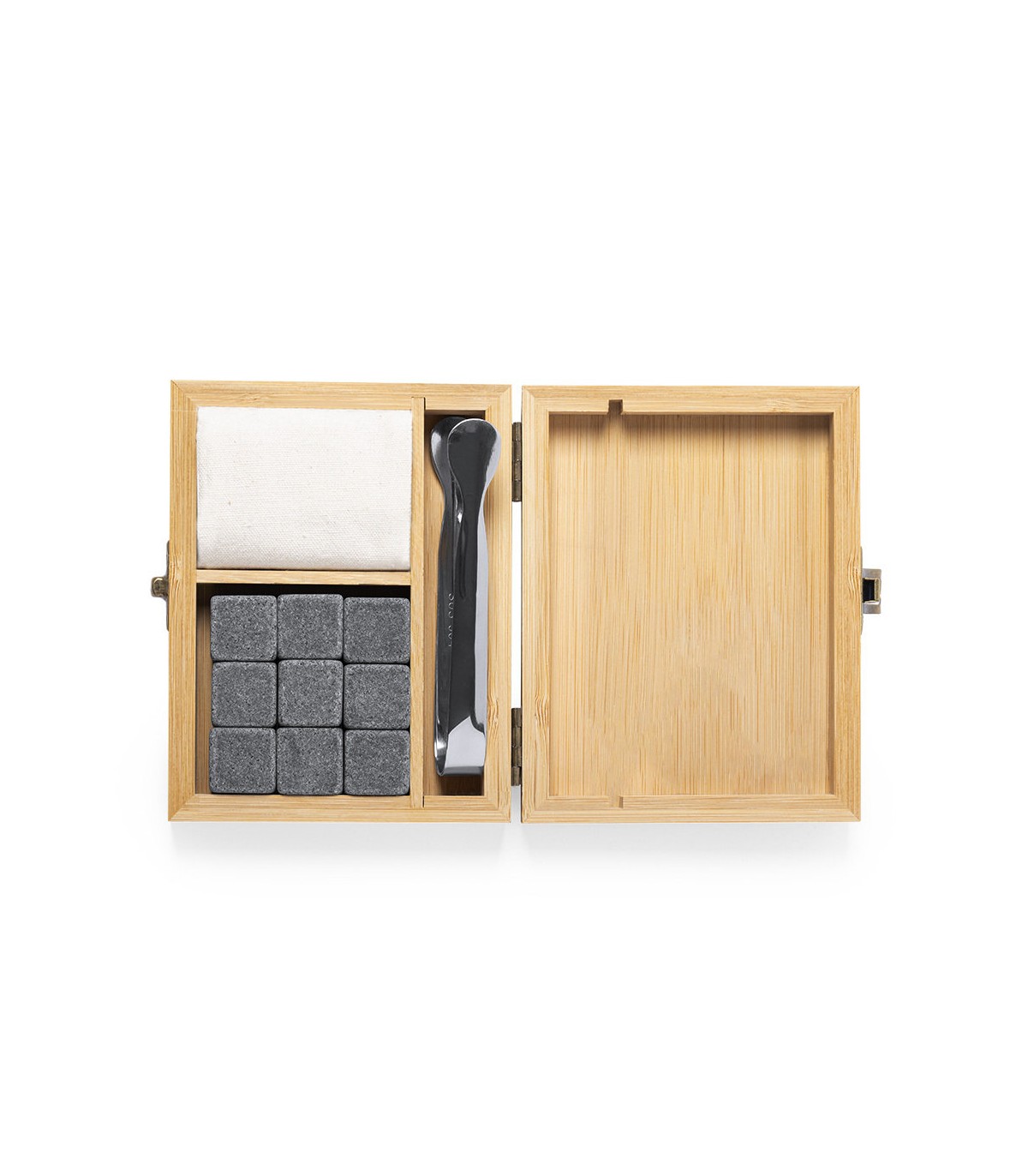 Set de 9 cubitos enfriadores de bebida personalizados que Incluye pinzas de acero inoxidable y funda de algodón. Presentado en estuche de bambú.