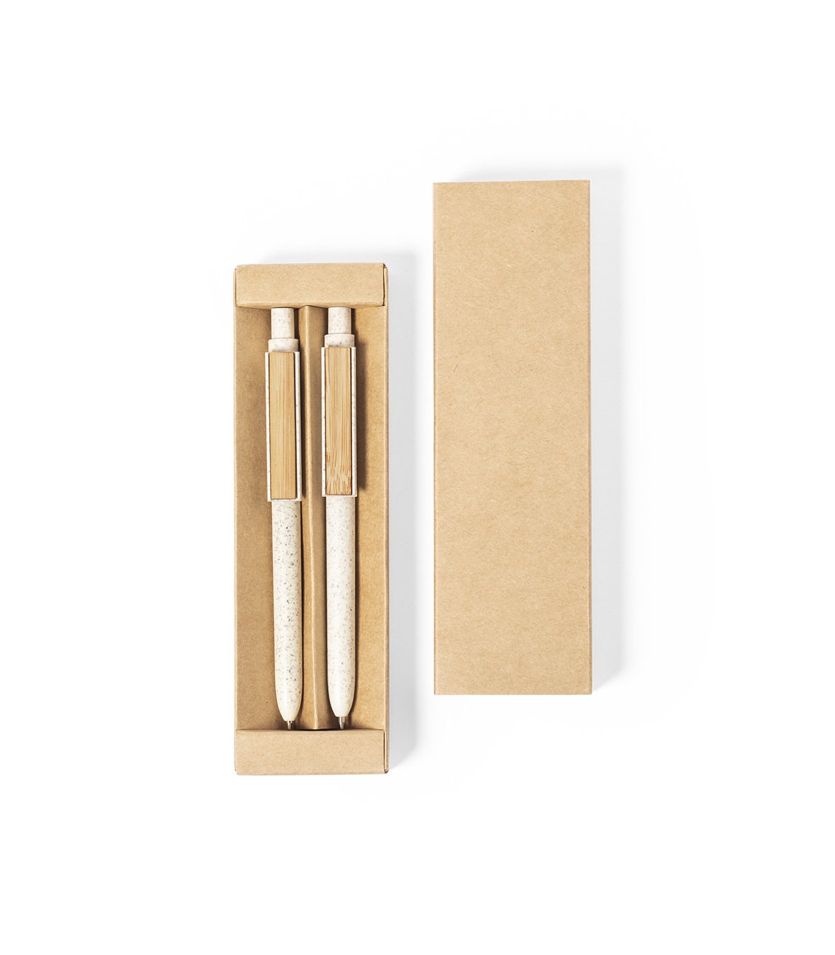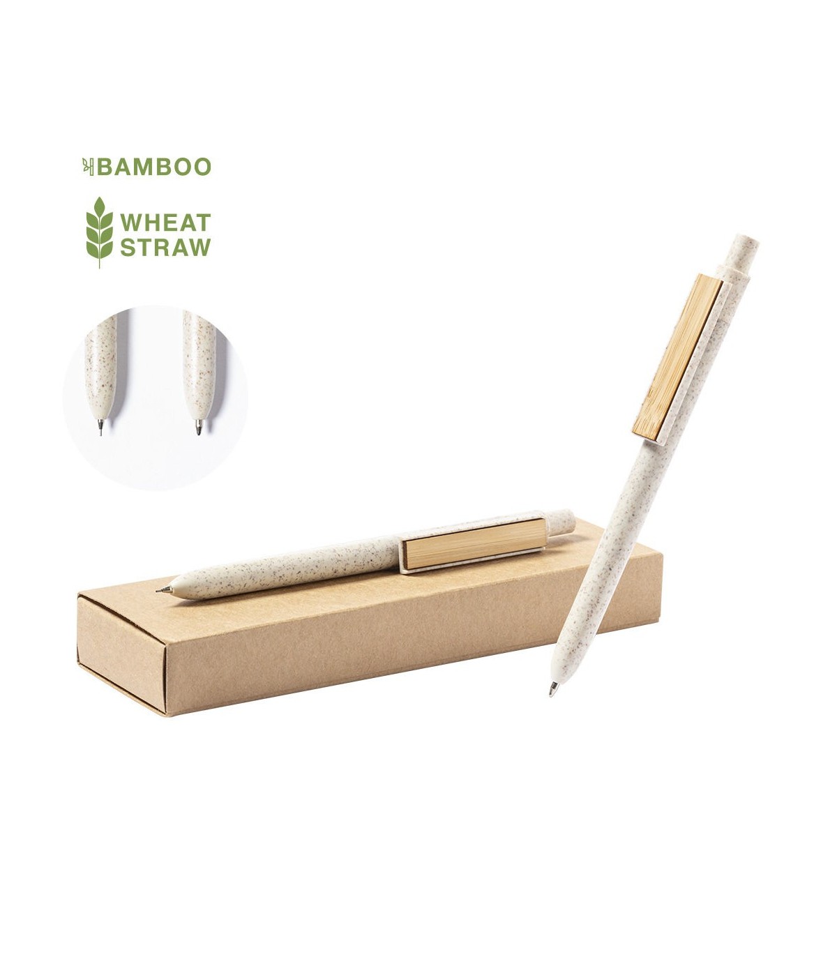Set de bolígrafo y portaminas de fabricación ecológica. elaborado en combinación de caña de trigo con clip en bambú, para así fomentar la utilización de materias primas naturales y reducir las emisiones contaminantes. Clip con amplia zona de marcaje. Bolígrafo en tinta azul y portaminas con 2 minas incluidas de 0,5mm. Presentado en estuche individual de cartón reciclado.Distintivo Wheat Straw en la parte superior del bolígrafo y portaminas.