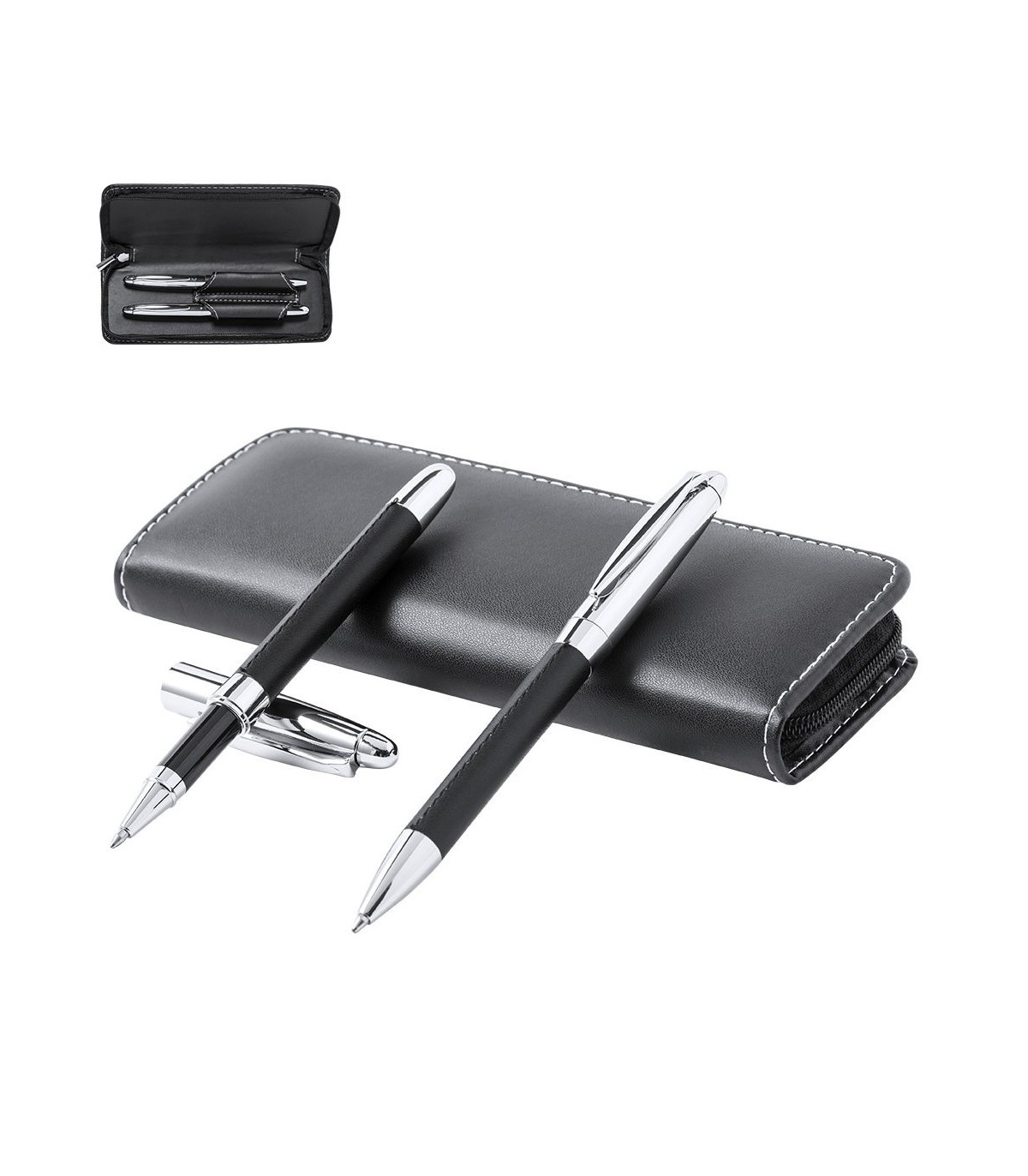 Set premium de bolígrafo y roller. elaborado en elegante combinación de polipiel en tonos negros y metal cromado. Bolígrafo de mecanismo giratorio en tinta azul y con cartucho jumbo. Roller con capucha y tinta gel en azul, carga jumbo. Presentado en estuche individual de polipiel con cierre de cremallera e interior a juego con compartimentos individuales.