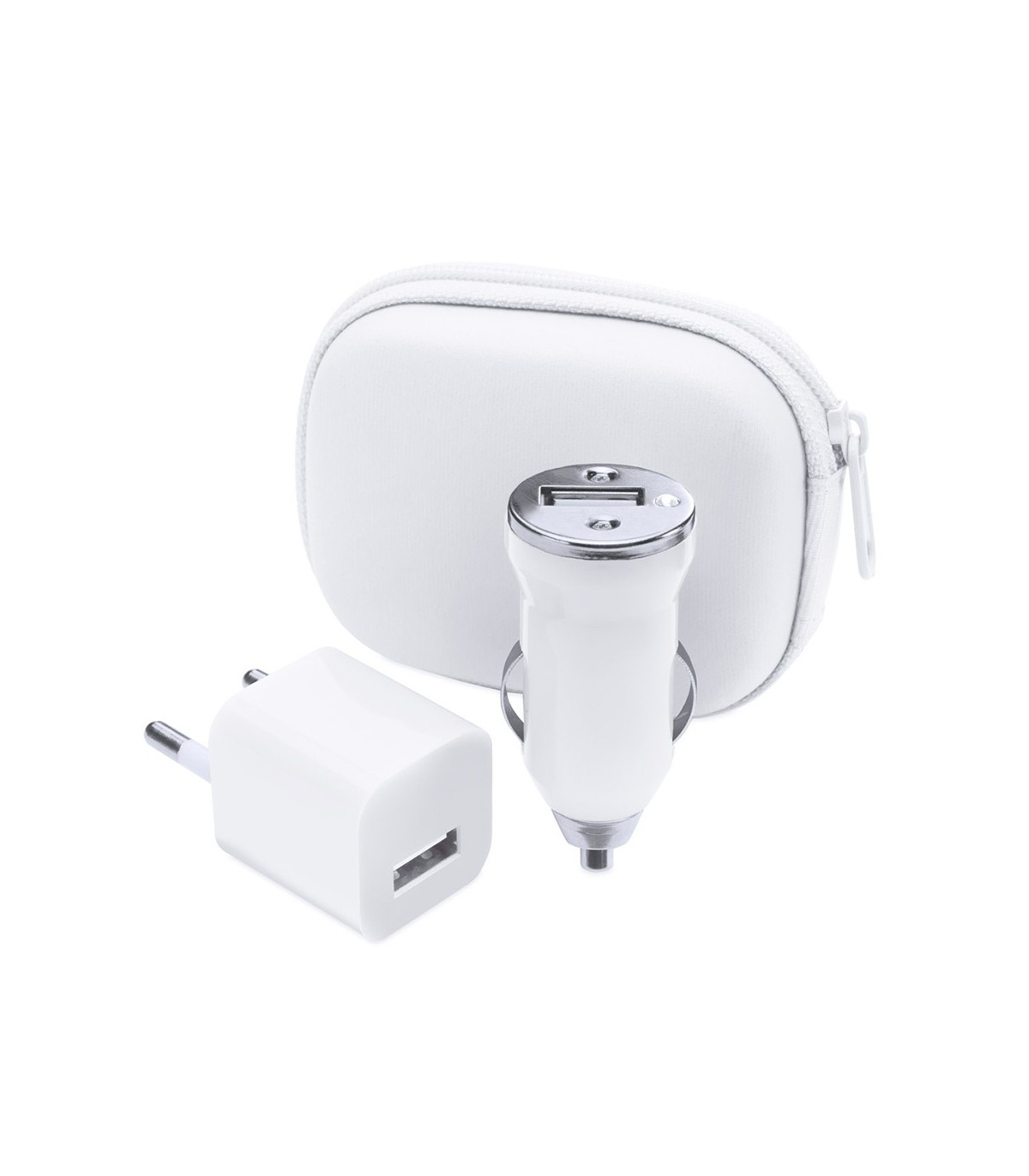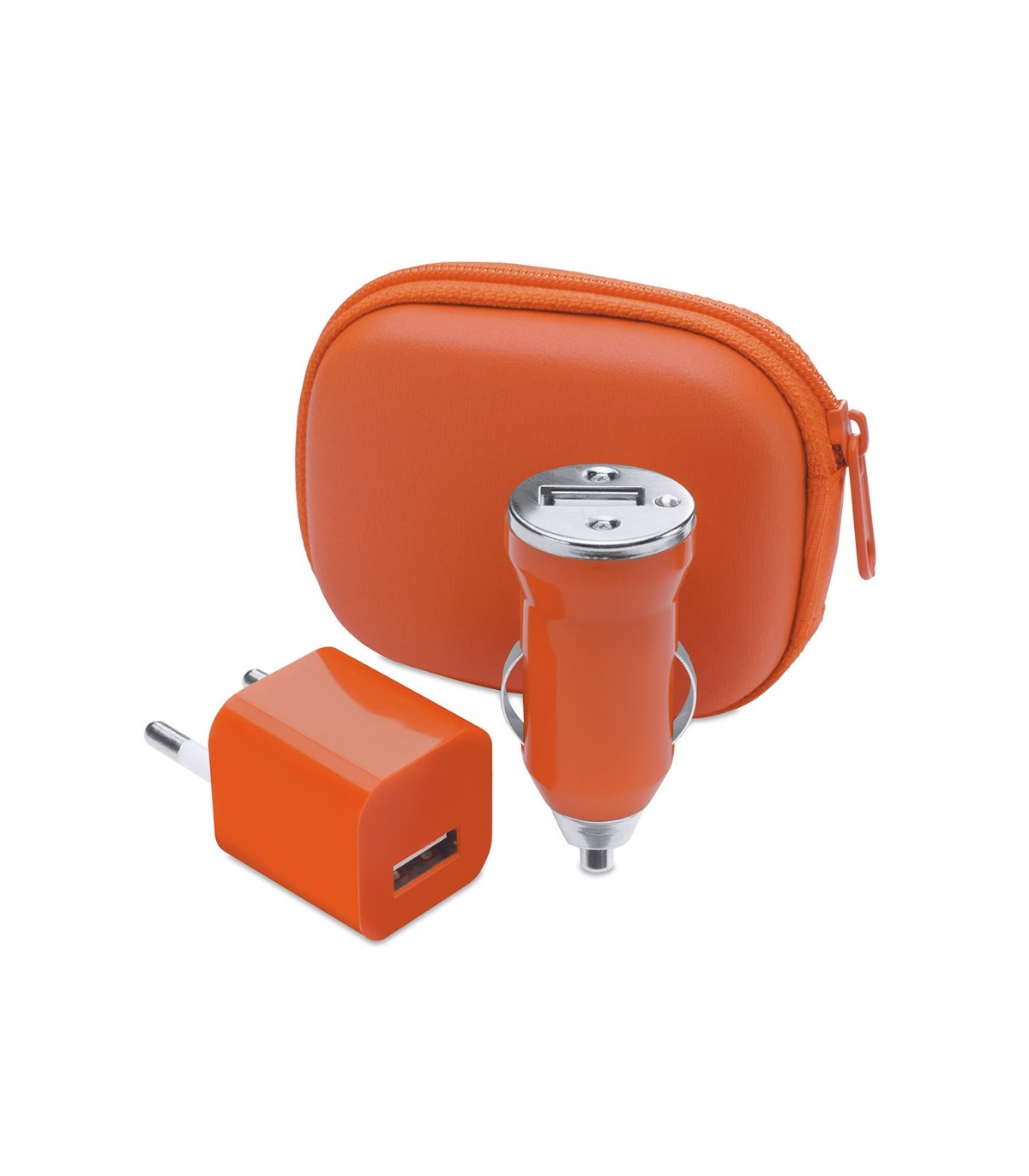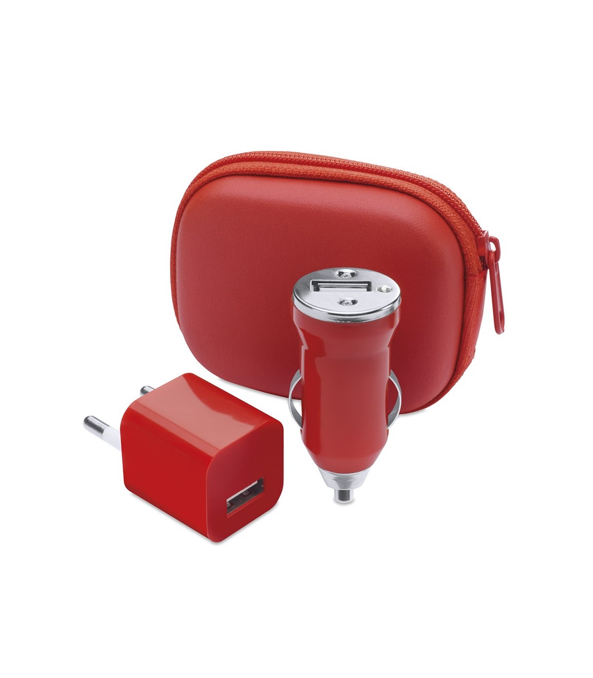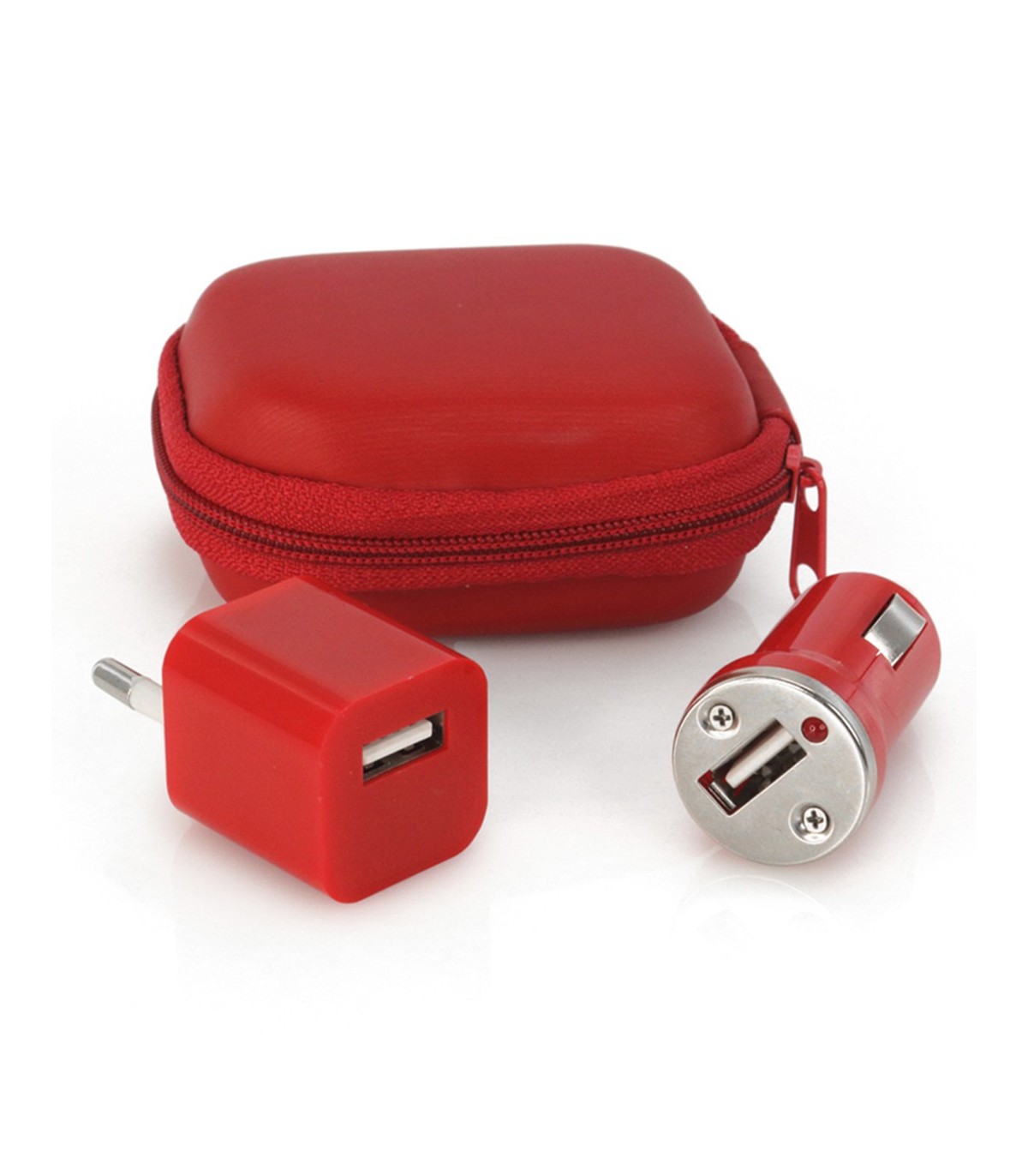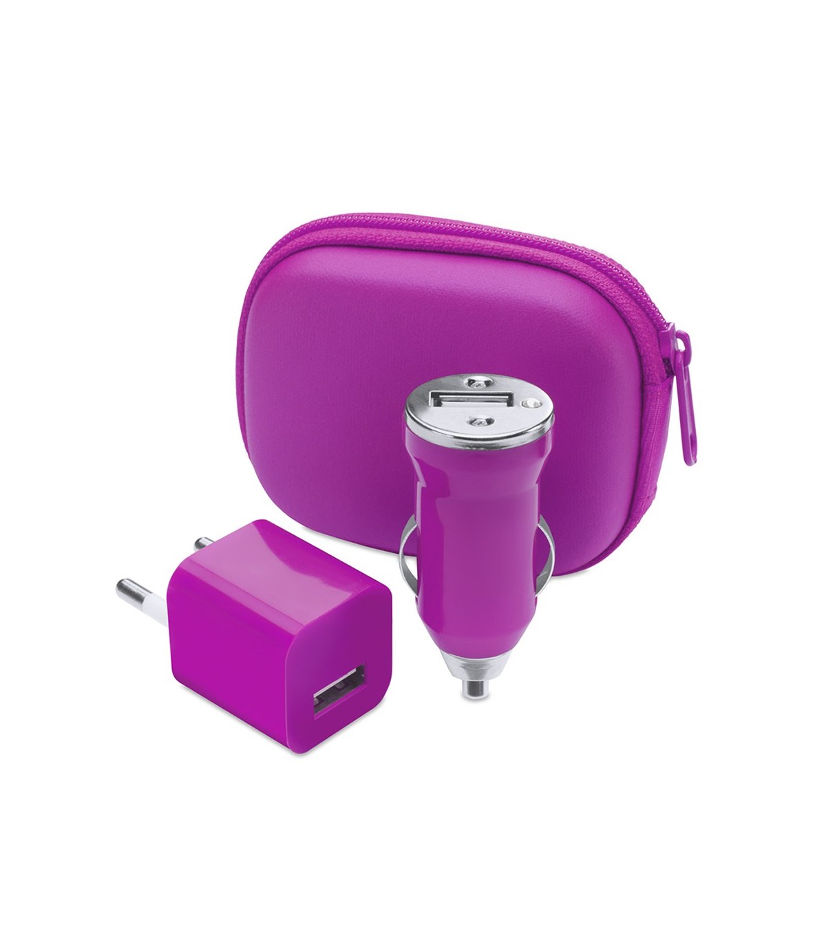 Set de cargadores USB para coche, con LED indicador de carga, y pared, de 1.000 mA de capacidad de carga y en divertidos colores. Presentados en desenfadado y resistente estuche de polipiel a juego.