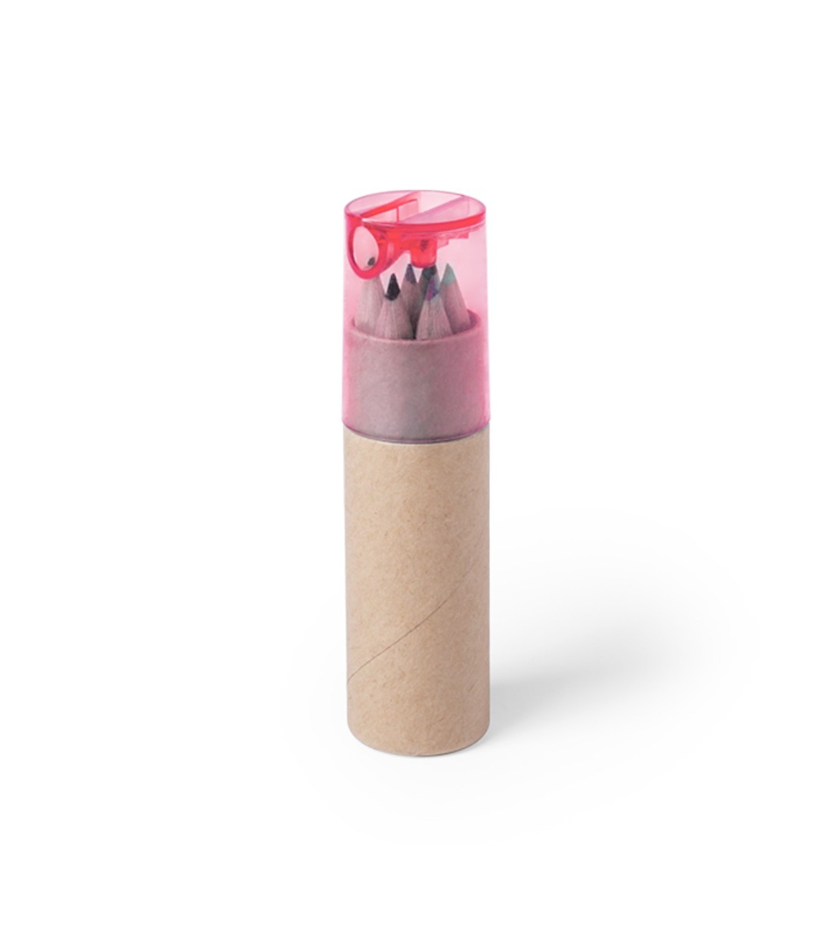 Set de 7 piezas en estuche con cuerpo en cartón natural y capucha transparente en variados colores. Incluye 6 lápices de madera con cuerpo hexagonal de acabado natural y sacapuntas integrado en tapadera.