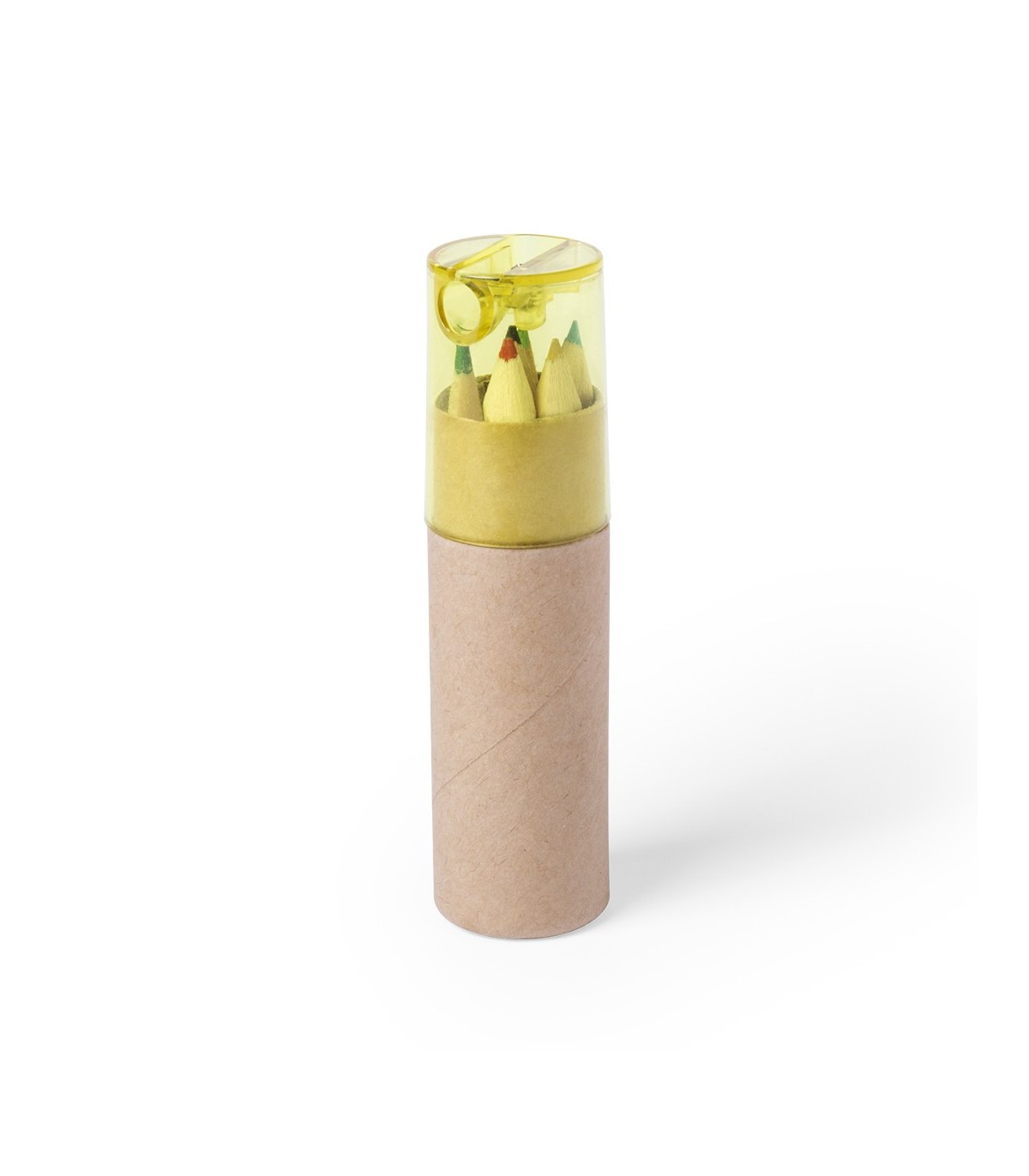 Set de 7 piezas en estuche en cartón natural y capucha con 6 lápices de madera y sacapuntas integrado en tapadera.