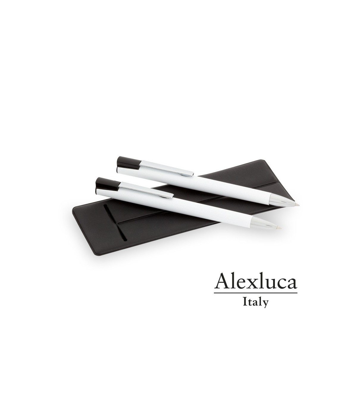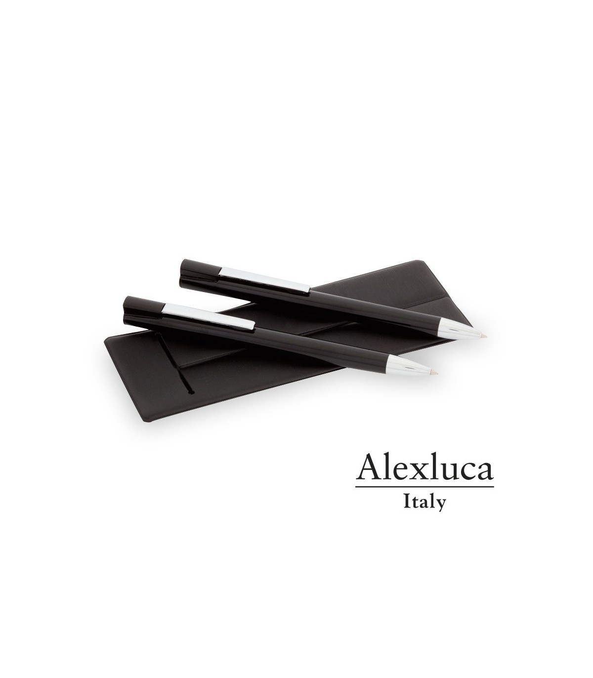 Pack de Bolígrafos y portaminas metálicos de la marca Alexluca promocionales para publicidad, con funda negra. Regalos personalizados. Set Siodo Alexluca.