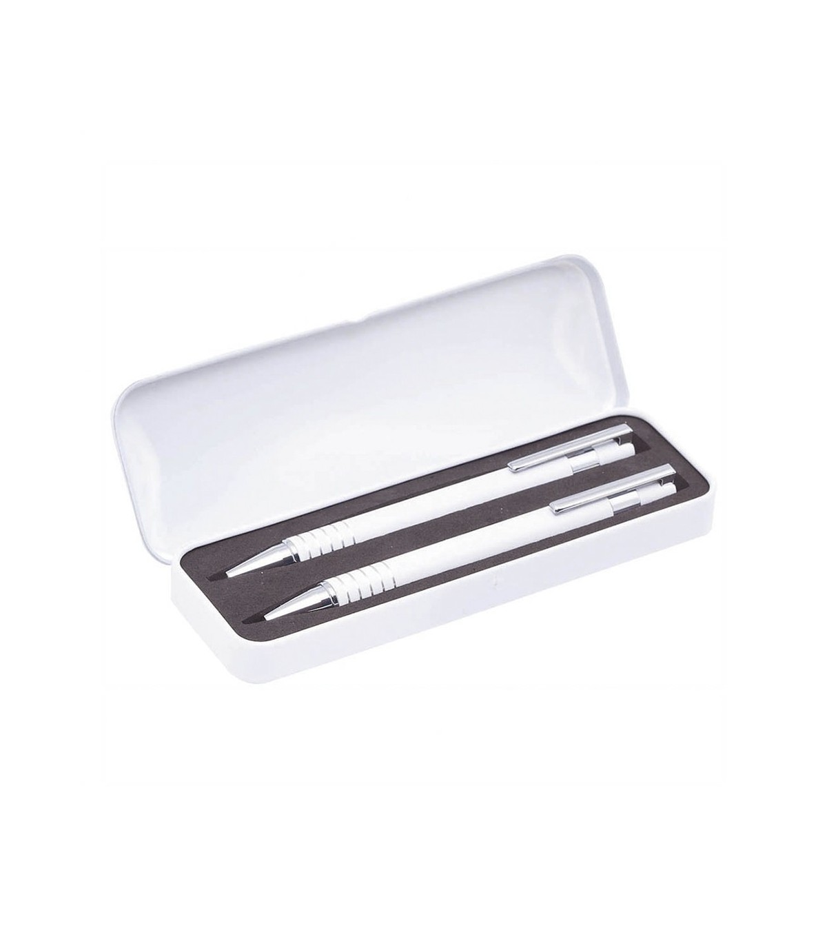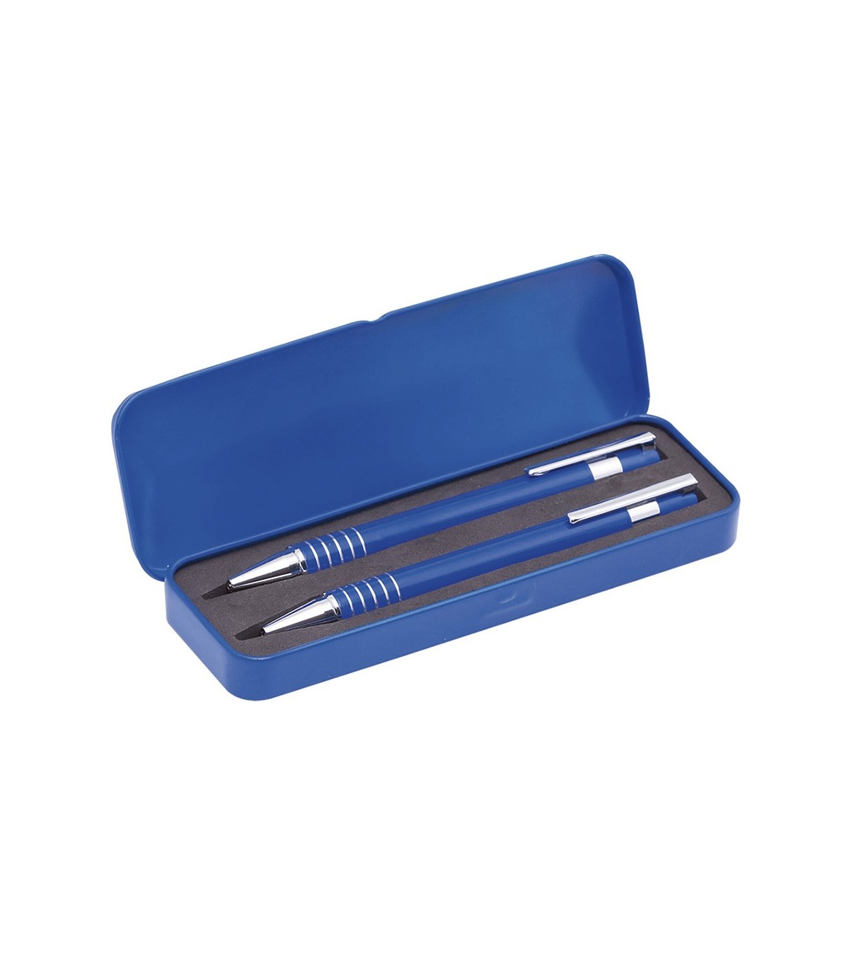 Set de bolígrafo de apertura con mecanismo pulsador y portaminas en original diseño bicolor. De cuerpo metálico en suave acabado de llamativos colores y accesorios en colores plateados. Con empuñadura anillada y presentado en resistente estuche individual metálico a juego con suave espuma troquelada. Bolígrafo de cartucho jumbo con tinta azul y portaminas con minas de 0,7mm incluidas.