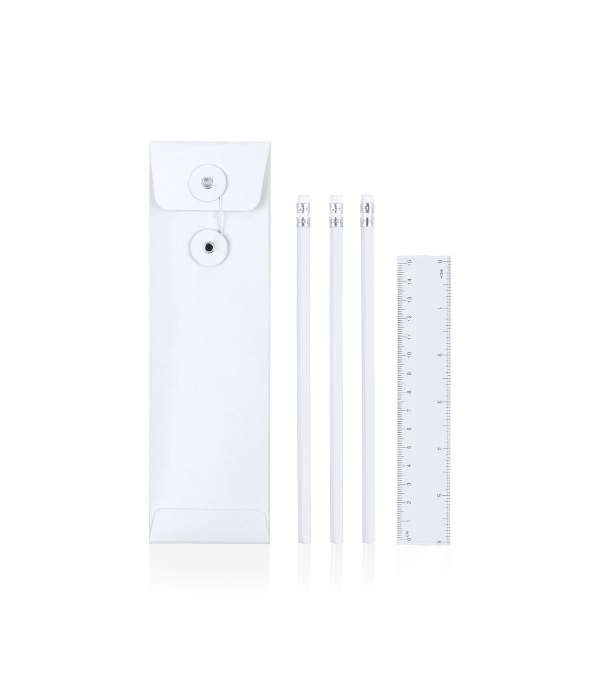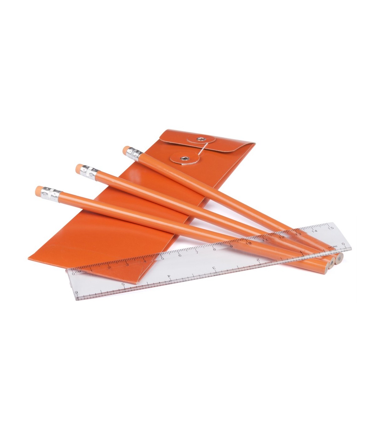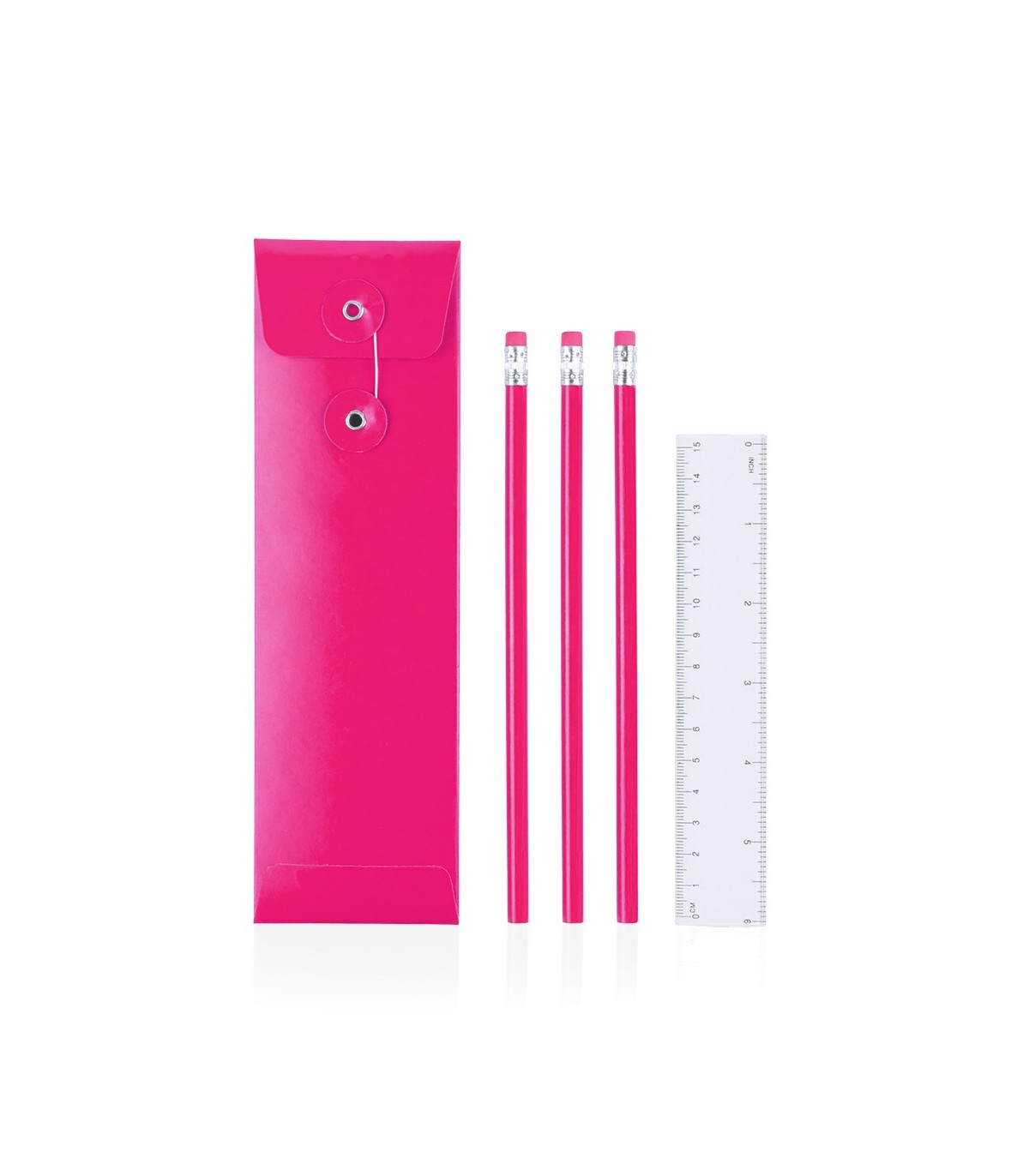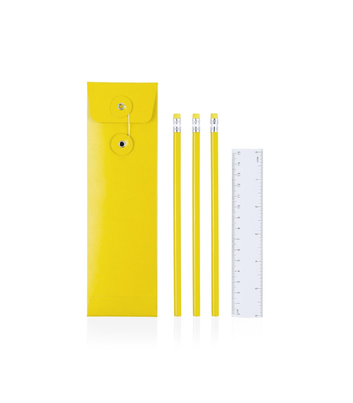 Set de 4 piezas con 3 lápices de madera con cuerpo redondo de acabado brillo en alegres colores con mina negra y regla transparente de 15cm con sistema métrico en centímetros/pulgadas. Presentado en estuche de cartón a juego con cierre de hilo.
