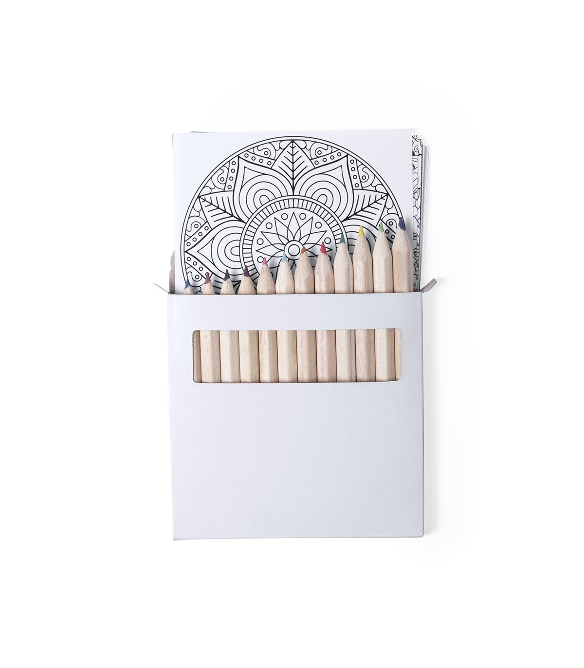 Set de lápices y láminas para colorear con diseños mandala para colorear y relajarse. Incluye 12 lápices de cuerpo hexagonal y 12 láminas con diseños diferentes. Presentado en estuche de cartón con ventana.