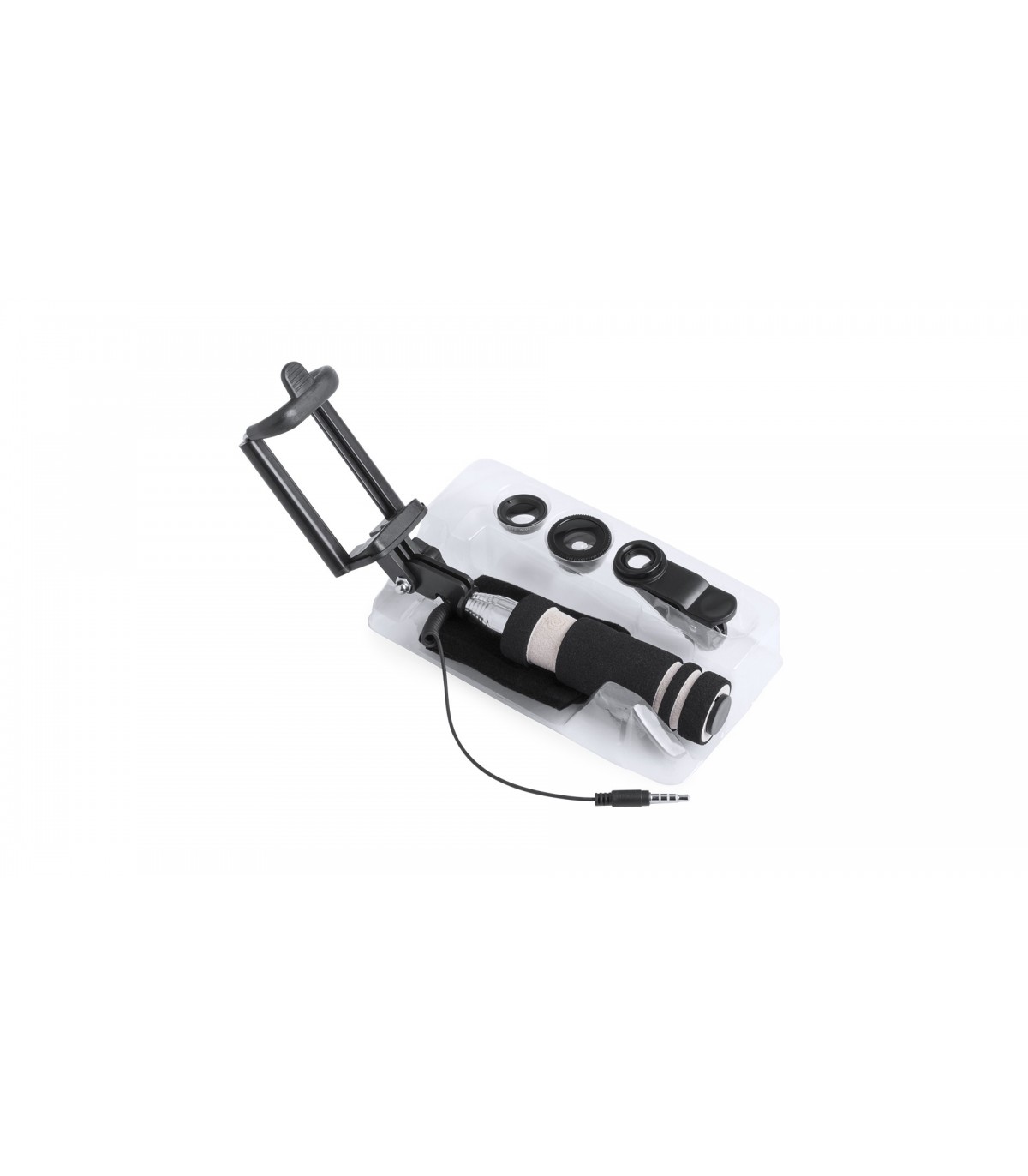 Set de palo selfie con lentes de efectos. Incluye monopod plegable de diseño minimalista, con conexión jack de 3,5mm, sistema antigiro y disparador integrado en mango. Recorrido de acero inox y sistema de almohadillas en el soporte para así ofrecer un óptimo ajuste y protección del smartphone, además de una tuerca de ajuste a fijar según la inclinación que se desee, para así hacerse selfies todavía más variados y divertidos. Compatible con todo tipo de smartphones y especialmente diseñado para marcaje en láser y con accesorios a juego. Incluye 3 lentes de aluminio y cristal, con efectos -ojo de pez-, -macro- y -gran angular-, con paño limpiador de microfibra y presentadas en una bolsita de terciopelo con cordones autocierre. Set presentado en atractiva caja de diseño.