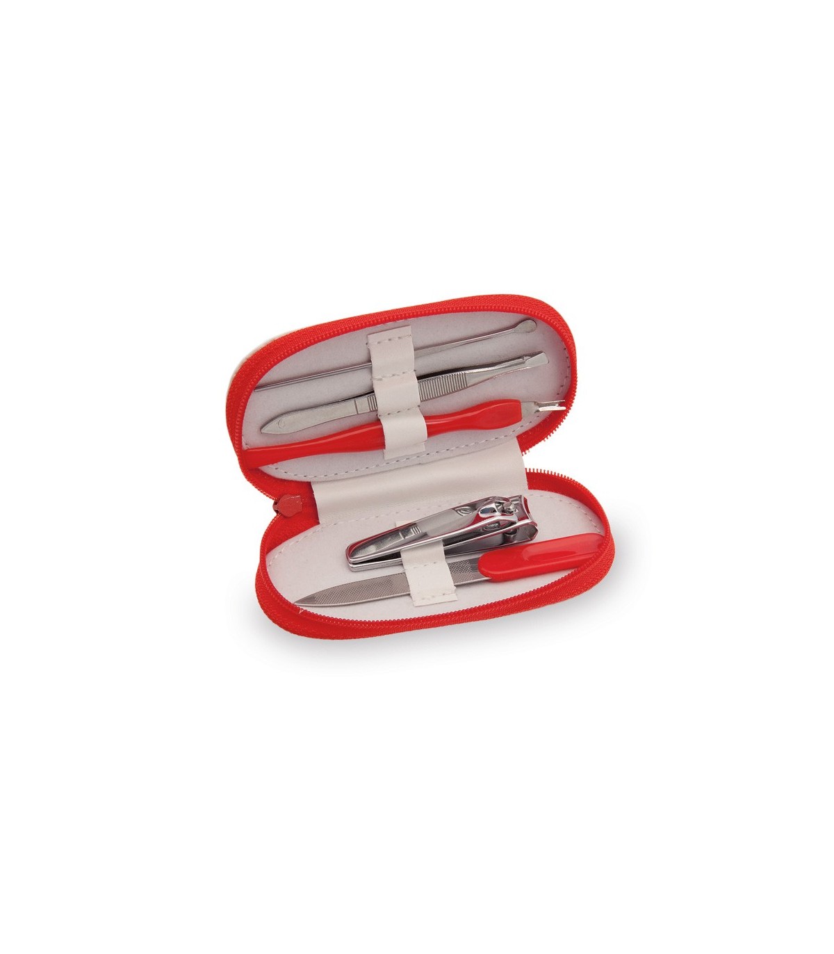 Set de manicura de 5 accesorios de acero inox en estuche de polipiel de originales colores para imprimir con cierre de cremallera. Incluye cortacutículas, lima, cortaúñas, pinzas y accesorio para uñas.