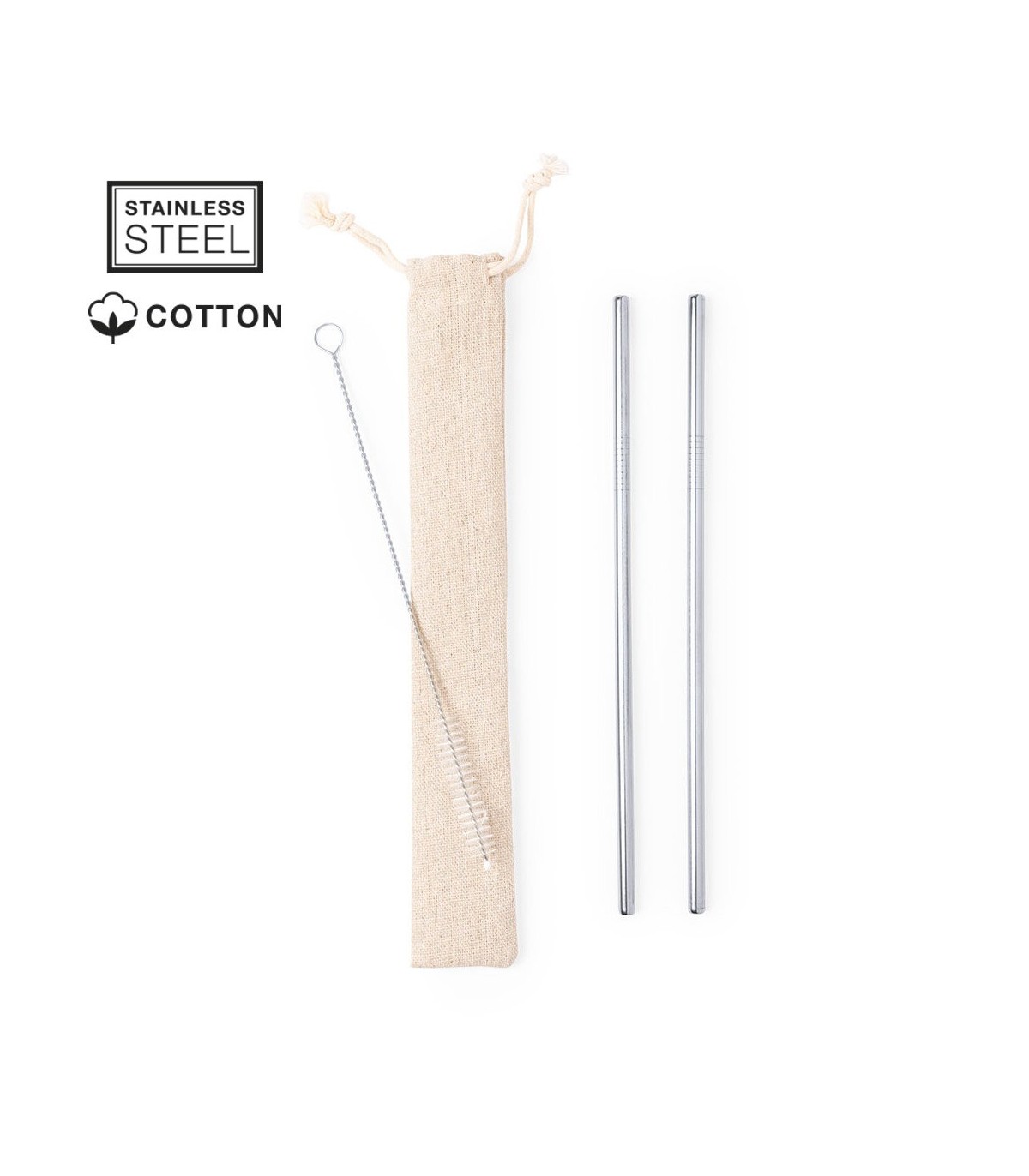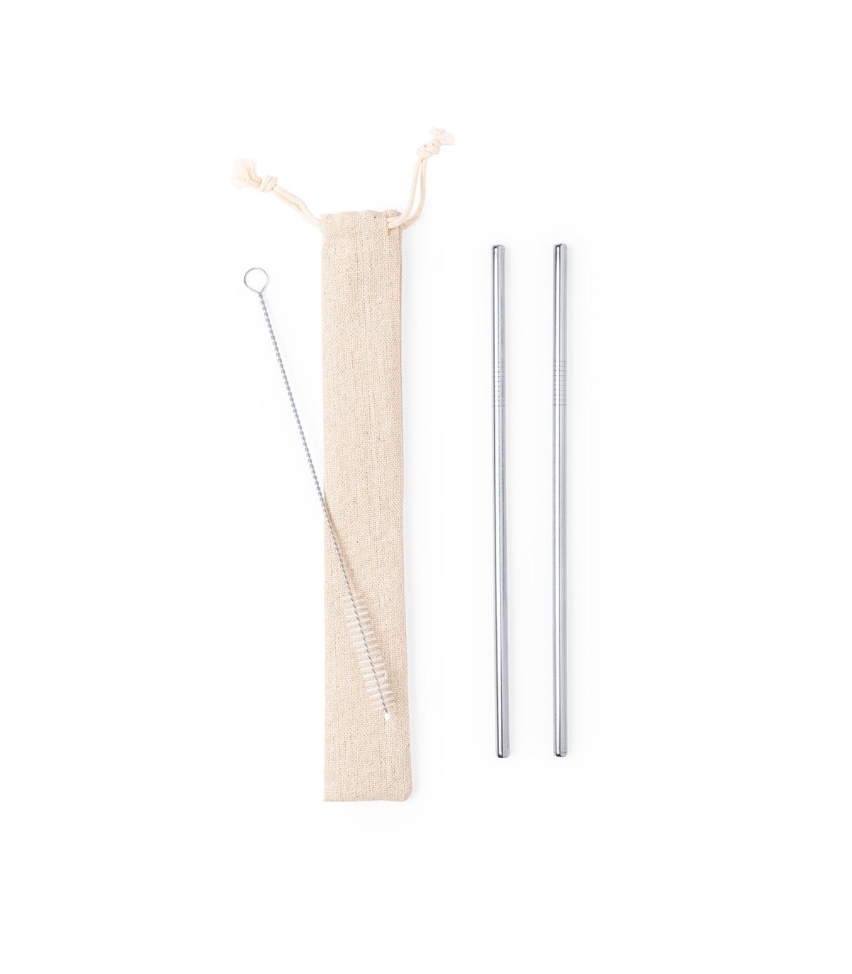 Set de 2 pajitas reutilizables ideales para regalos promocionales de catering. Con accesorio limpiador incluido y presentadas en bolsita de algodón natural con cuerdas autocierre.