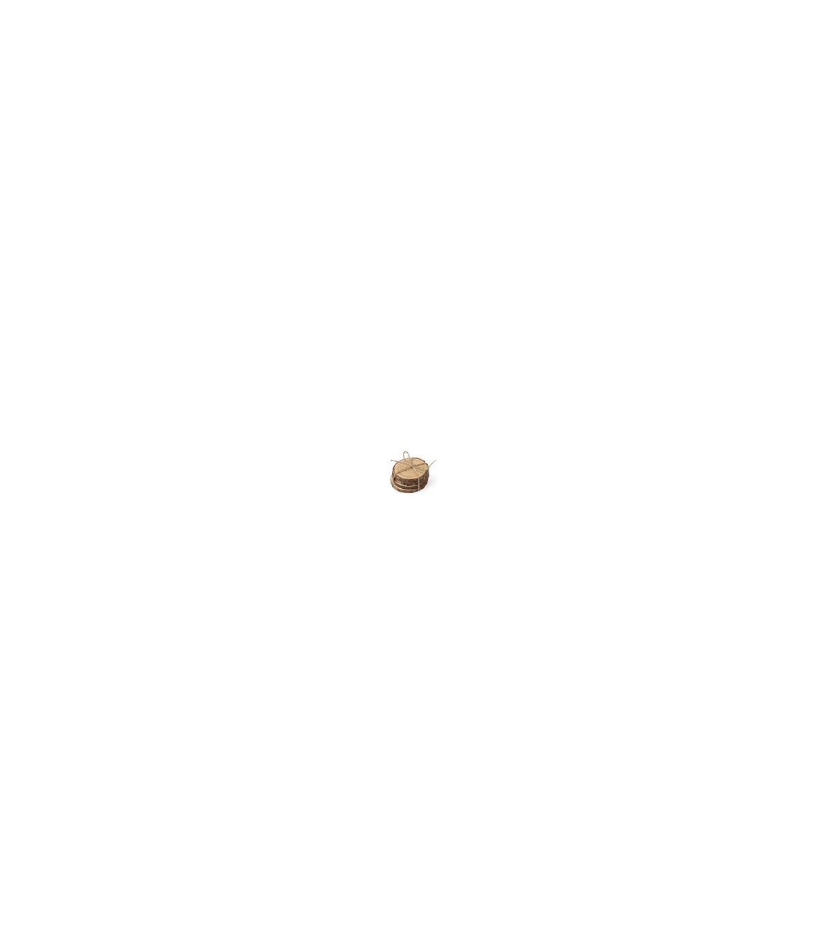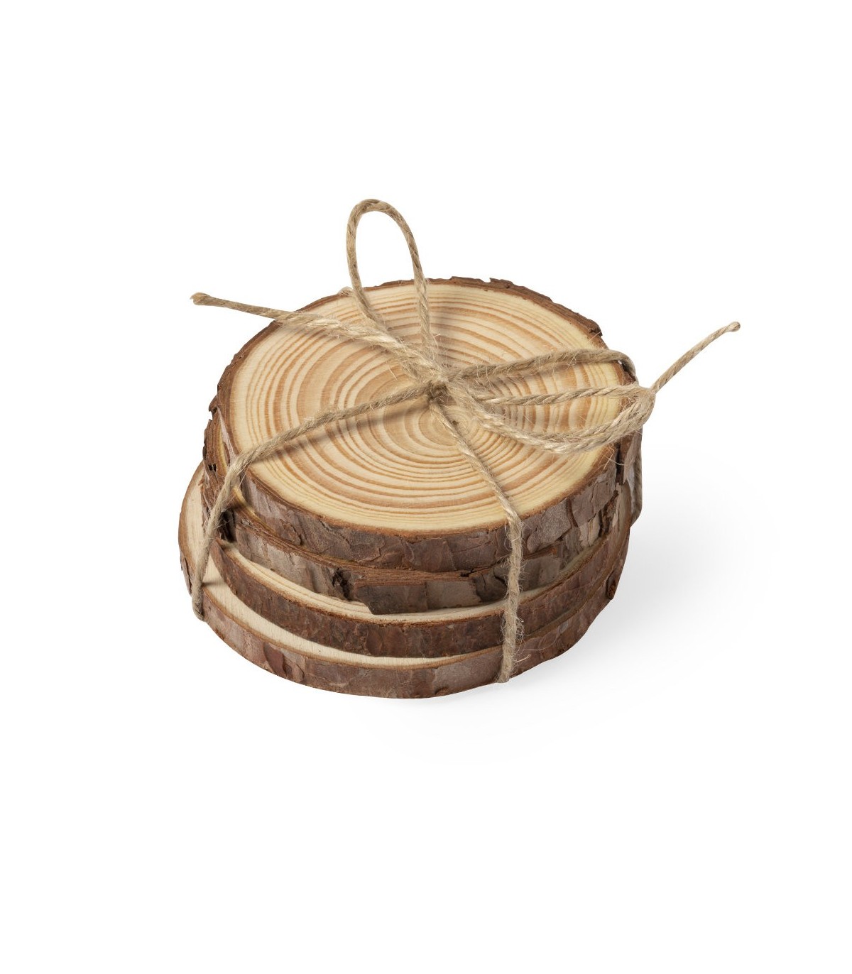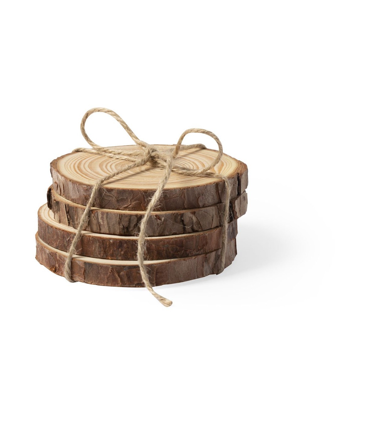 Set de posavasos en madera de pino natural. Incluye 4 piezas de aproximadamente 1cm de grosor. Corte natural, con diámetros de posavasos entre 8 y 10 cm, con cuerda en yute natural.