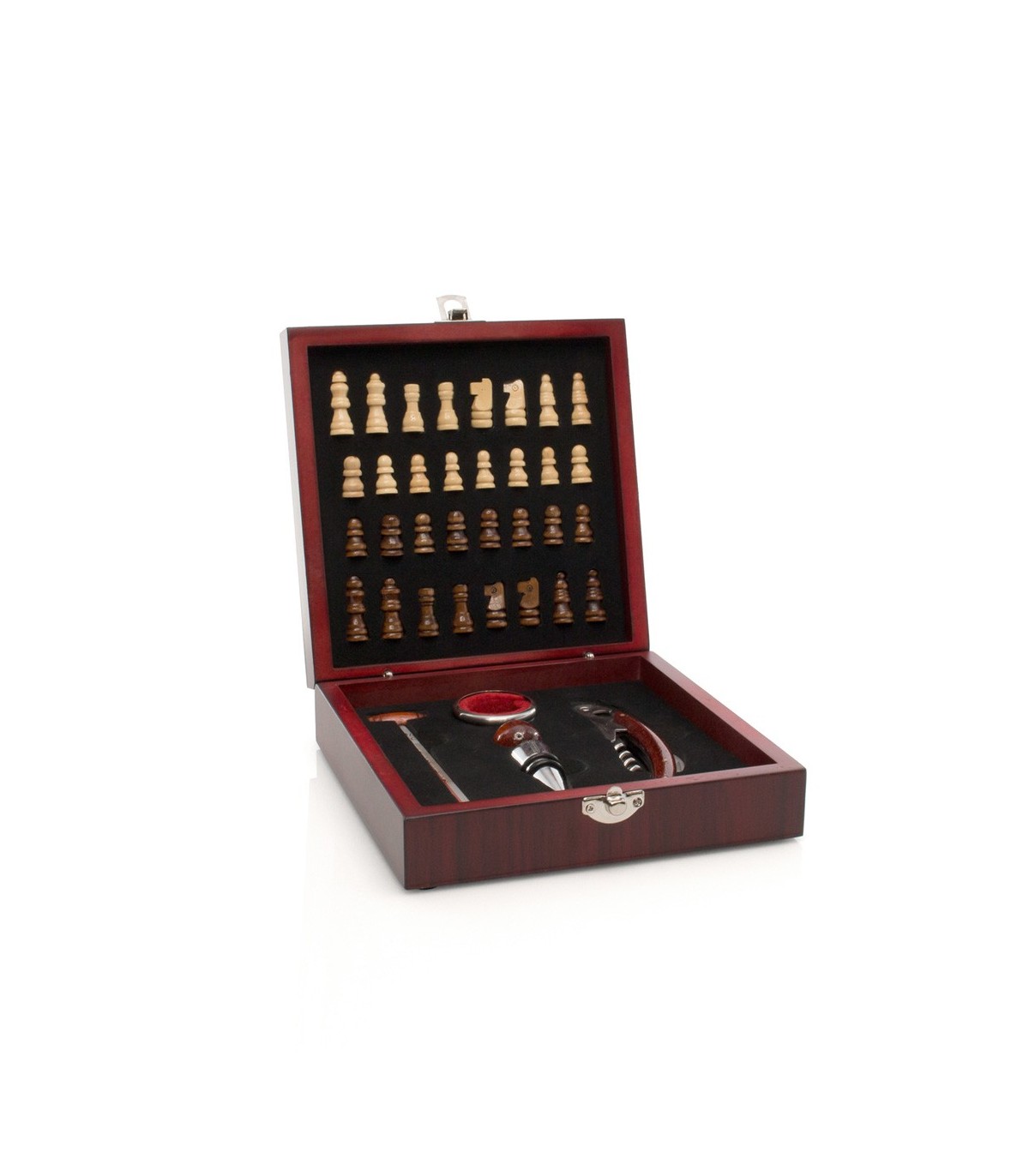 Original set de vinos ajedrez -piezas incluidas- acabado en madera natural. Con cierre de seguridad y accesorios de acero inox y madera. Incluye sacacorchos con cortacápsulas y abridor, tapón, recogegotas y termómetro. Presentado en estuche individual con interior en suave espuma troquelada.