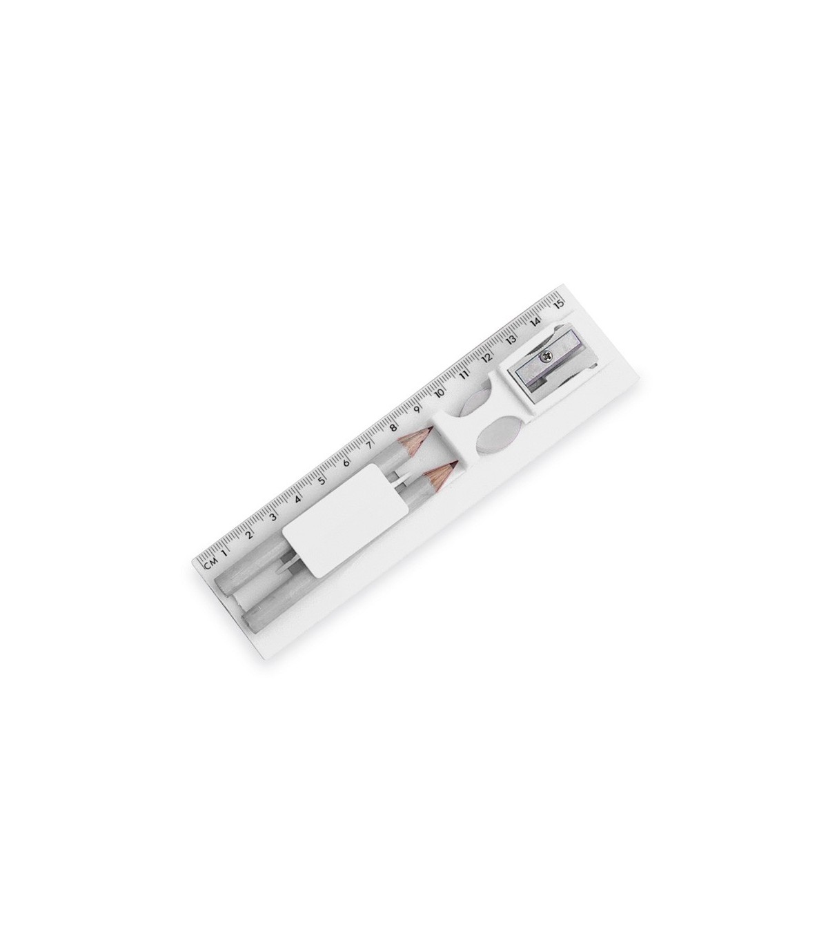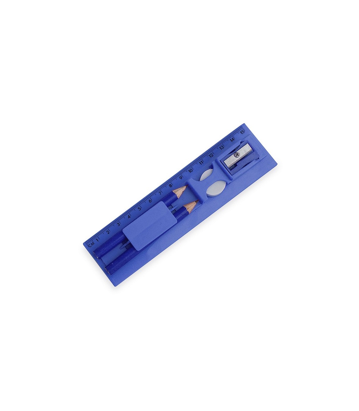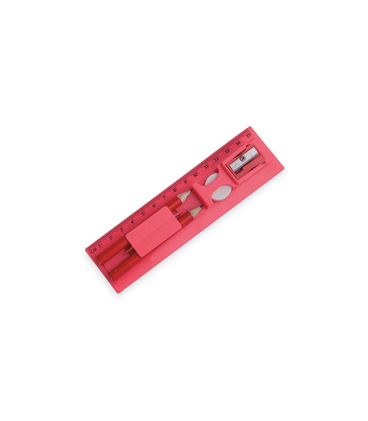 Set de 5 piezas fabricado en diferentes colores. Incluye 2 lápices de mina negra con cuerpo cilíndrico, goma y sacapuntas. Presentado en estuche regla con compartimentos.