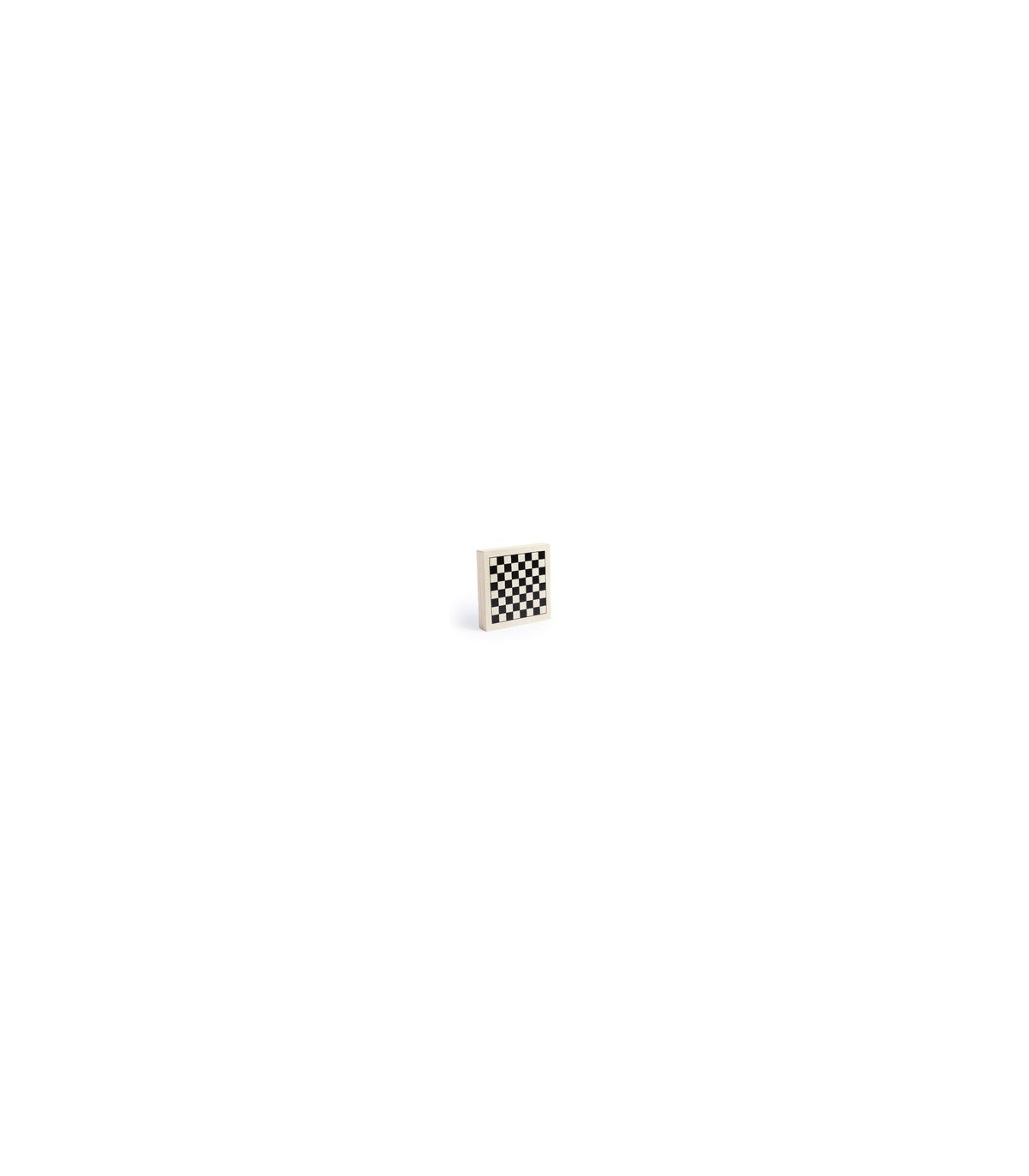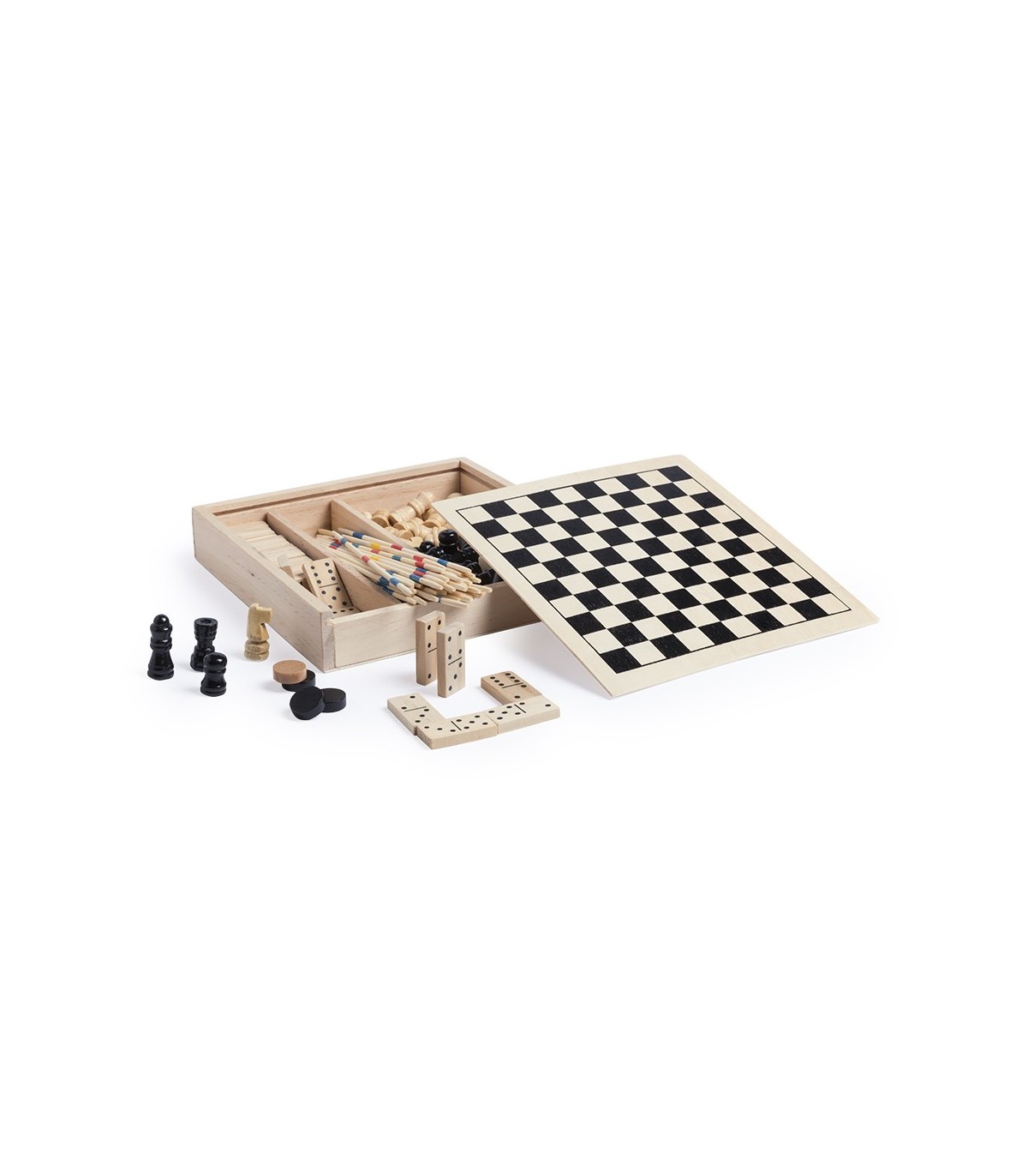 Set de juegos en madera. Incluye mikado, ajedrez, damas y dominó. Presentado en estuche de madera con tapa-tablero. Tablero con lado liso para marcaje.