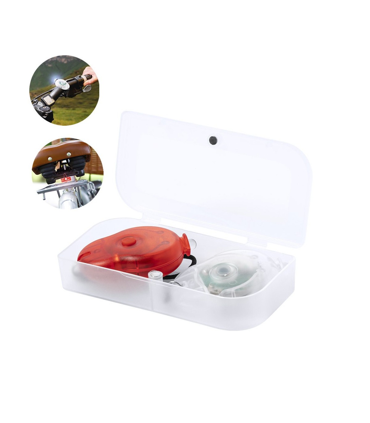 Set de luces de seguridad led para bici. Incluye 2 piezas, con dos posiciones de luz y presentadas en resistente estuche individual con cierre magnético. Alimentación a pilas de botón (incluidas).