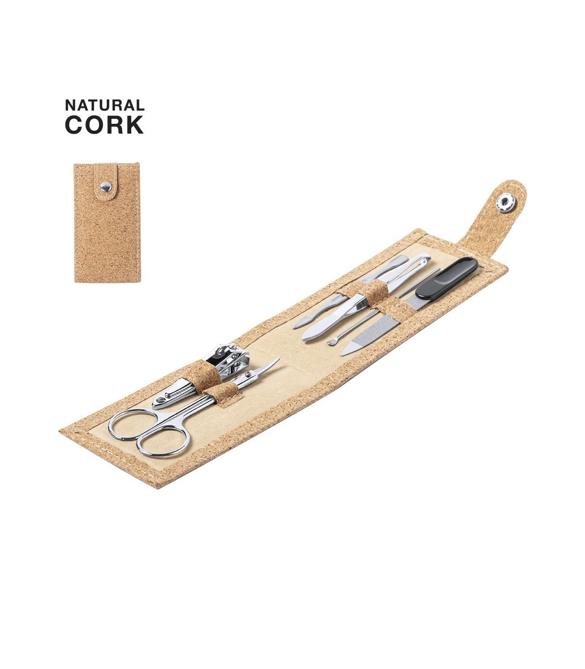 Set de manicura de fabricación ecológica con funda elaborada en corcho, para así fomentar la utilización de materias primas naturales y reducir las emisiones contaminantes. Incluye 6 accesorios de acero inox: tijeras, pinzas, cortaúñas, lima y 2 quitacutículas. Soportes interiores para accesorios y cierre de corchete. Totalmente desplegable para fácil marcaje.