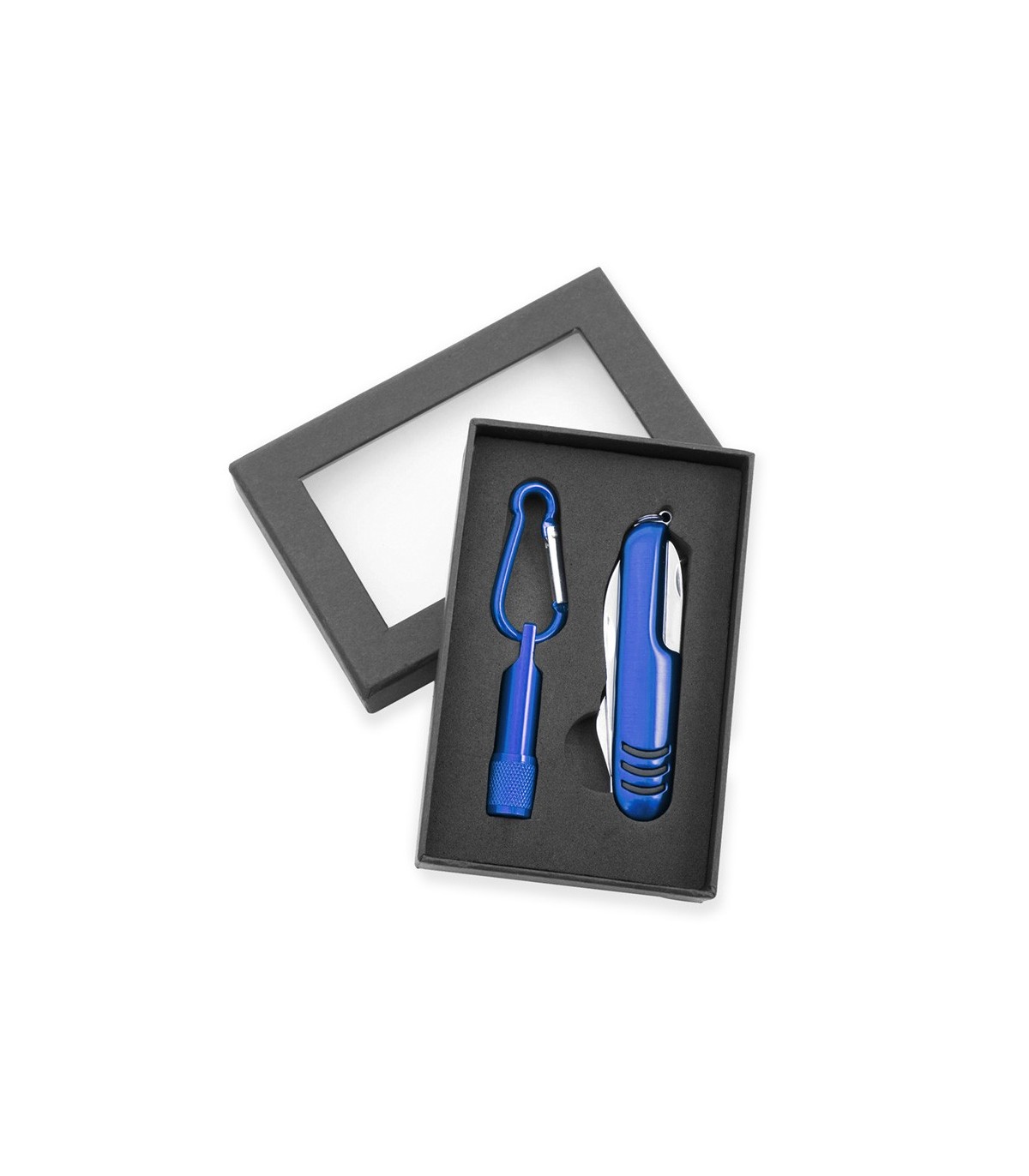 Set de aluminio de navaja multiusos con 7 funciones y linterna mosquetón. En variados colores y presentado en estuche individual con ventana y suave espuma interior troquelada. Pilas de botón incluidas.