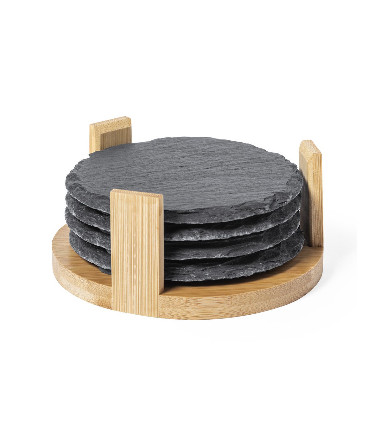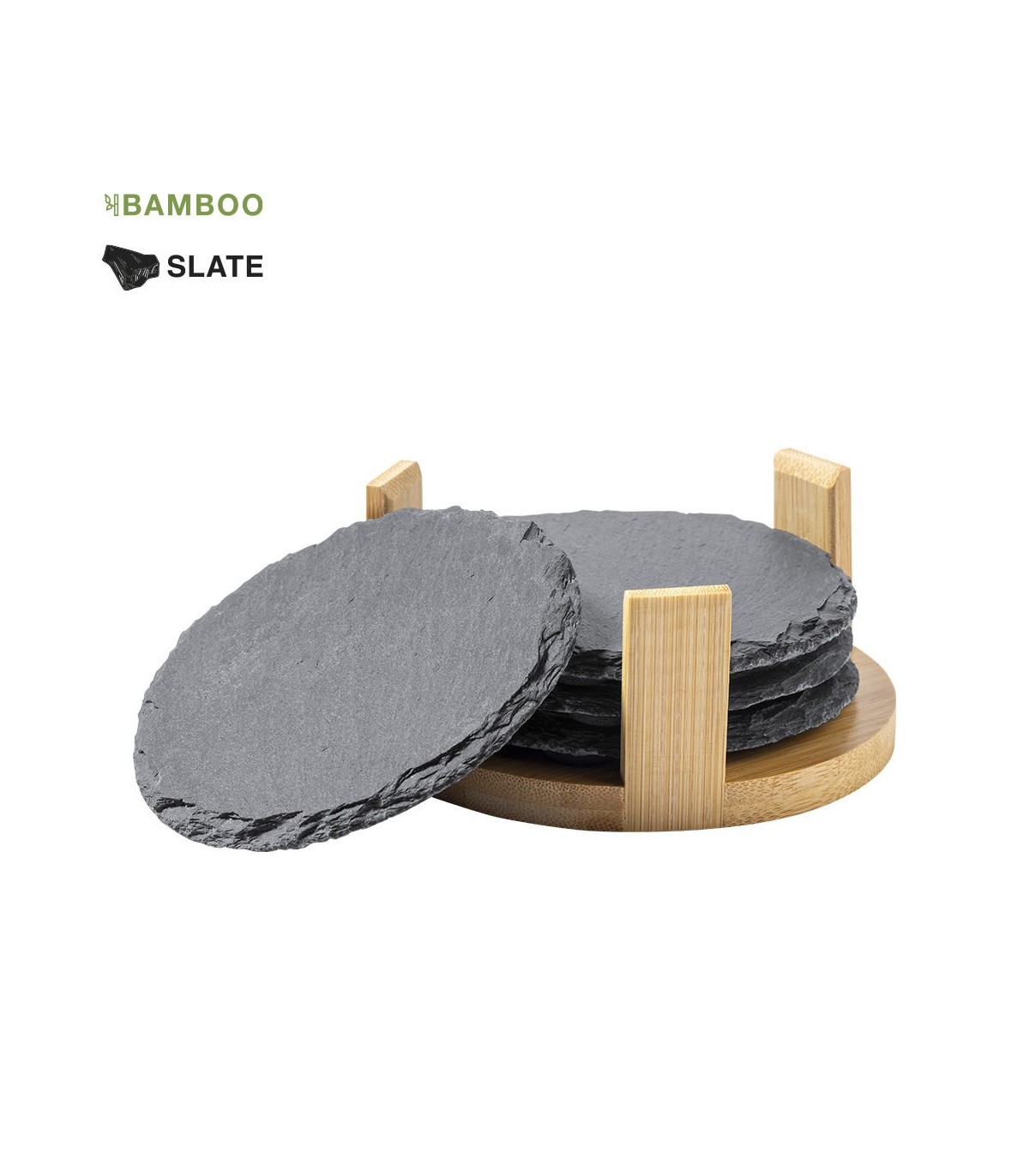 Set de 4 posavasos elaborados en pizarra natural, con soporte de bambú. Presentada en atractiva caja individual de diseño acabado kraft.