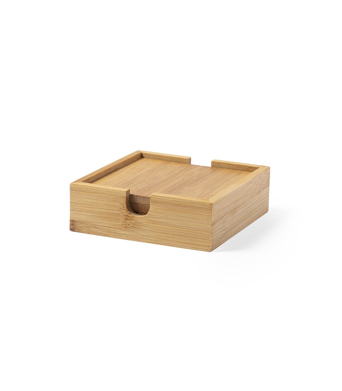 Set de 4 posavasos de línea nature en cajita. Fabricado en bambú lacado y presentado en atractiva caja individual de diseño eco.