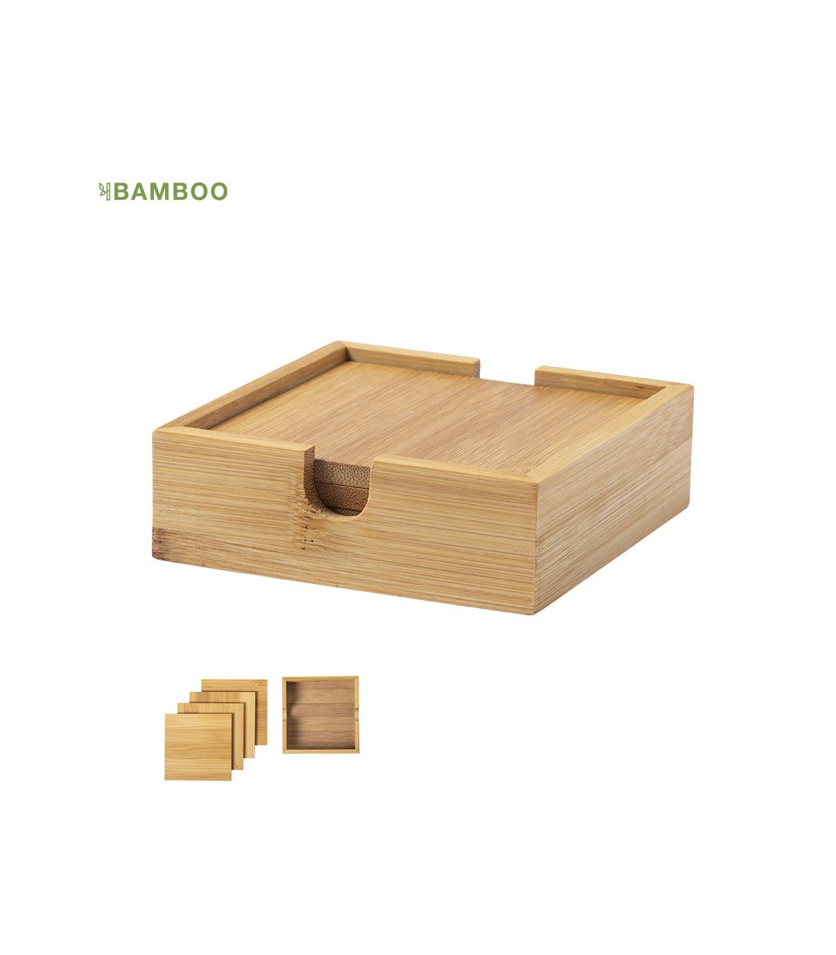 Set de 4 posavasos persoalizados, Fabricados en bambú lacado y presentado en atractiva caja individual de diseño eco.