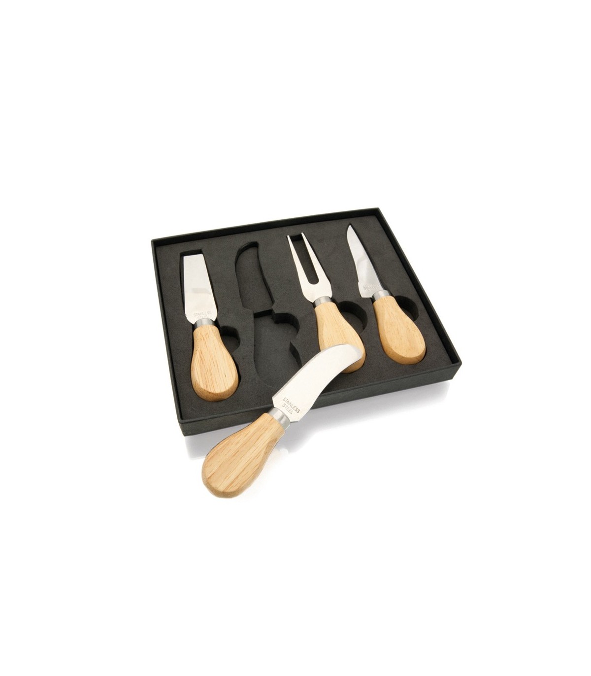 Set para quesos con utensilios de acero inox con mango en madera natural elegantes. Para personalizar en la caja como artículos de merchandising de empresas.