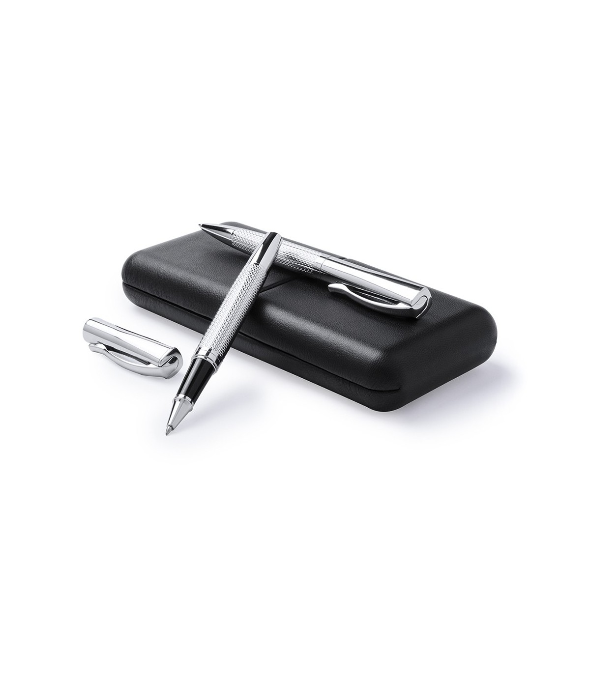 Elegante set de bolígrafo de apertura con sistema giratorio y roller de capucha en sobrio diseño. De cuerpo metálico antideslizante en acabado plateado brillante con clip a juego. Presentado en elegante y original estuche individual de polipiel en color negro con interior troquelado en suave antelina blanca. De cartucho jumbo con tinta azul de calidad alemana.