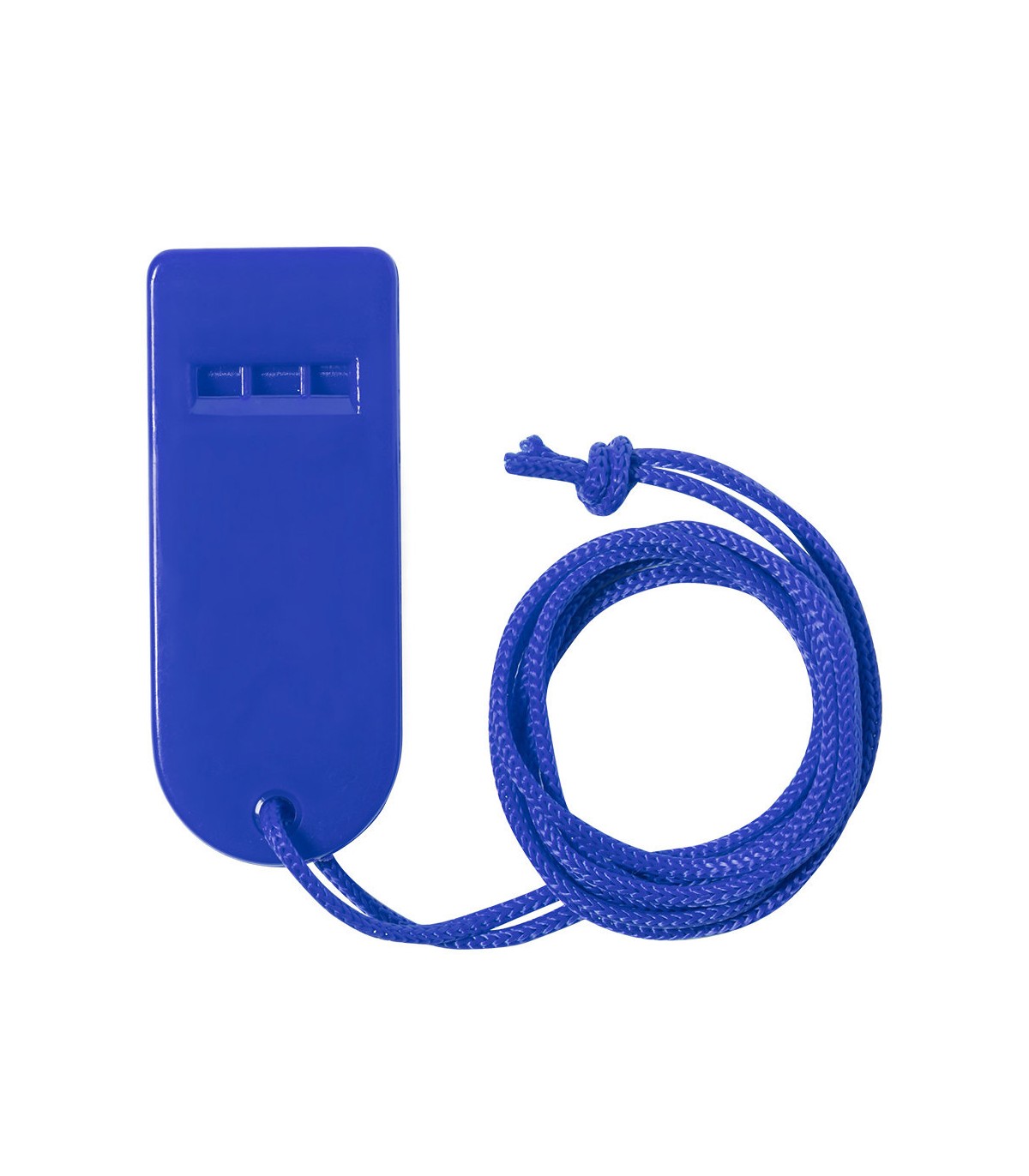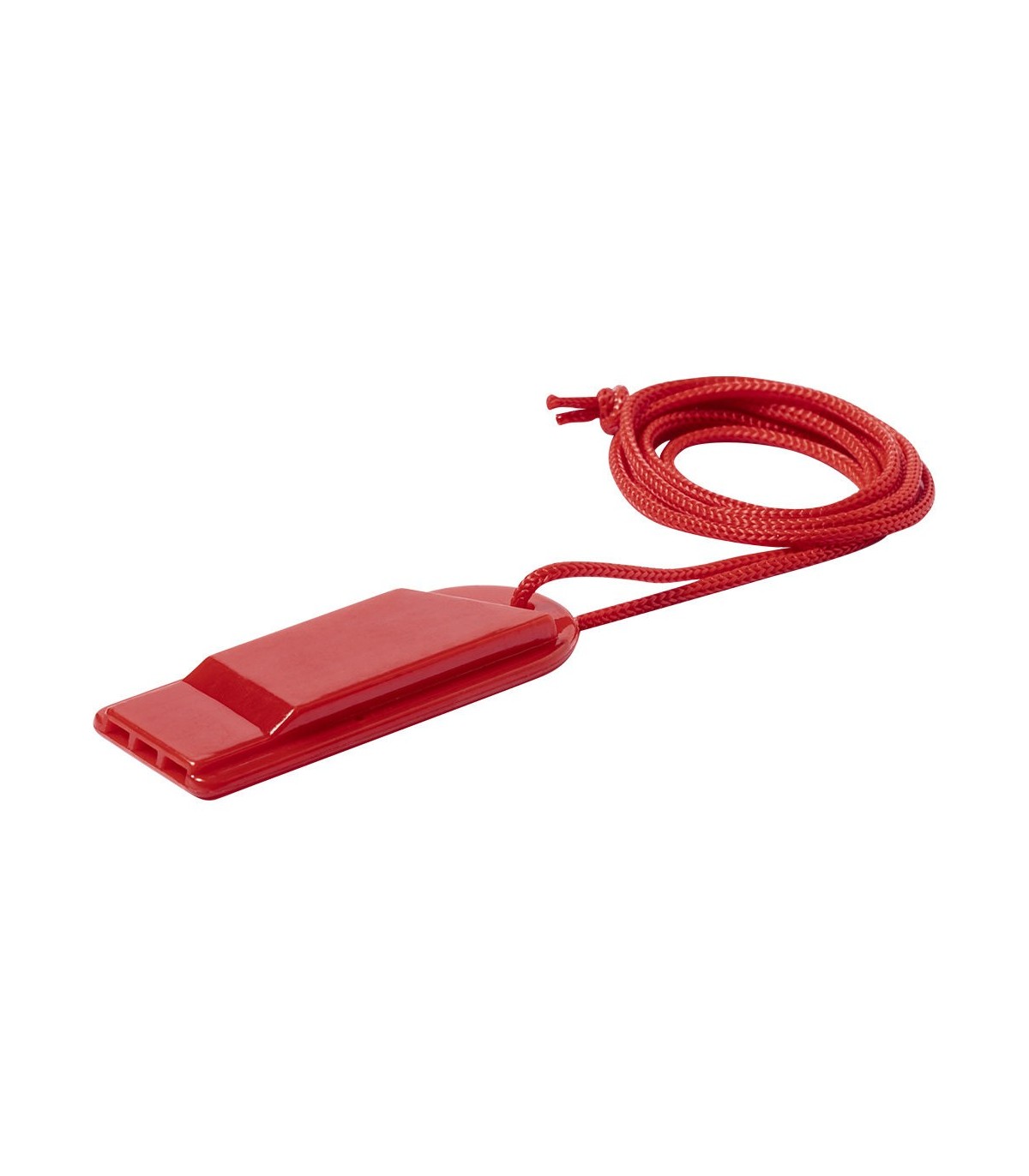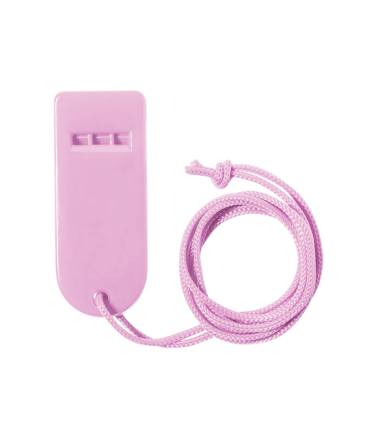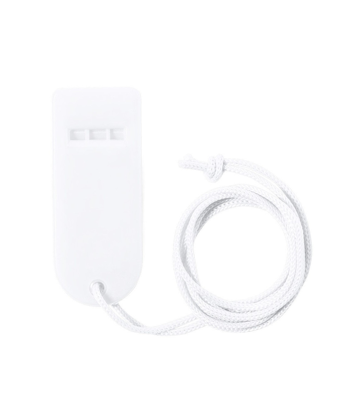 Silbato de original diseño y elaborado en resistente PS. Con cinta para el cuello a juego y disponible en extensa gama de colores.