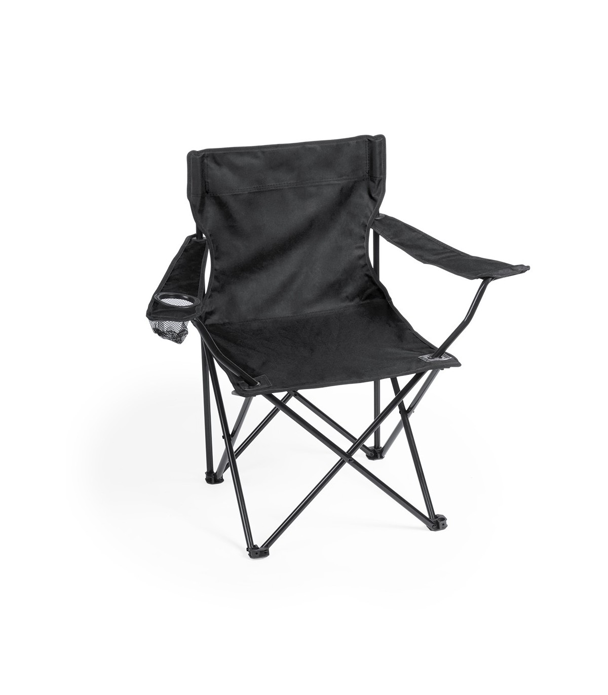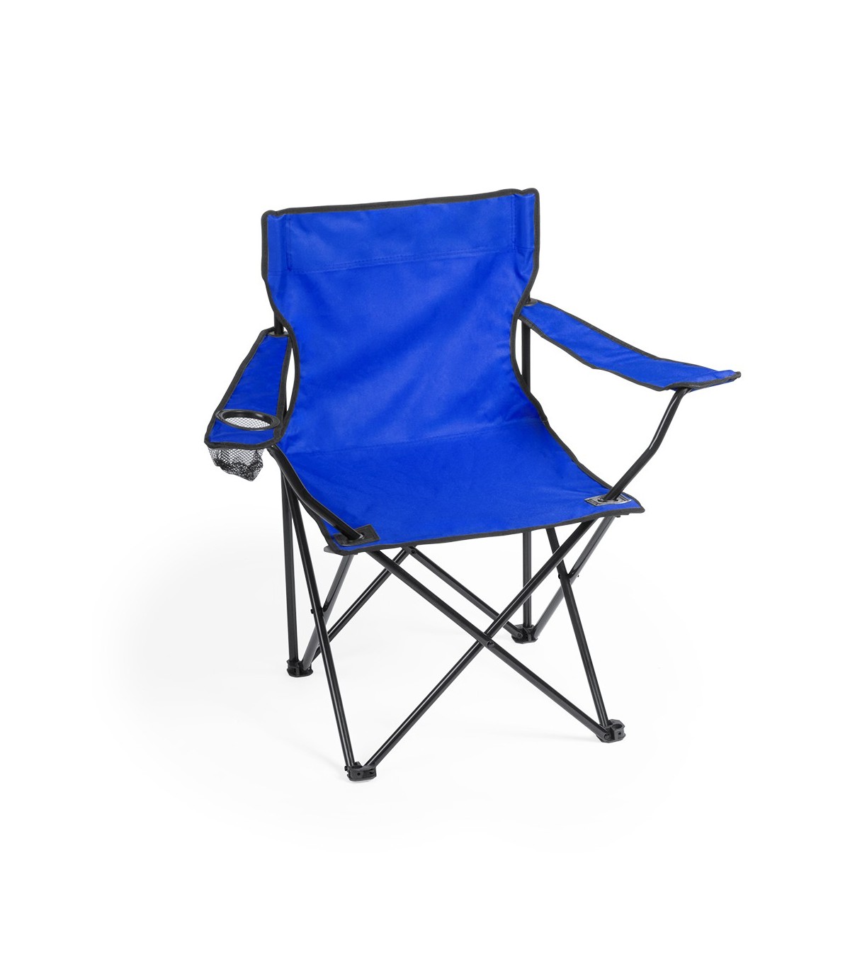 Sillas plegables cuerpo de metal tubular. En poliéster 600D con costuras reforzadas, apoyabrazos y bolsillo de redecilla integrado para bebida. Con refuerzos de goma en las patas con cordón auto cierre, accesorio de ajuste.