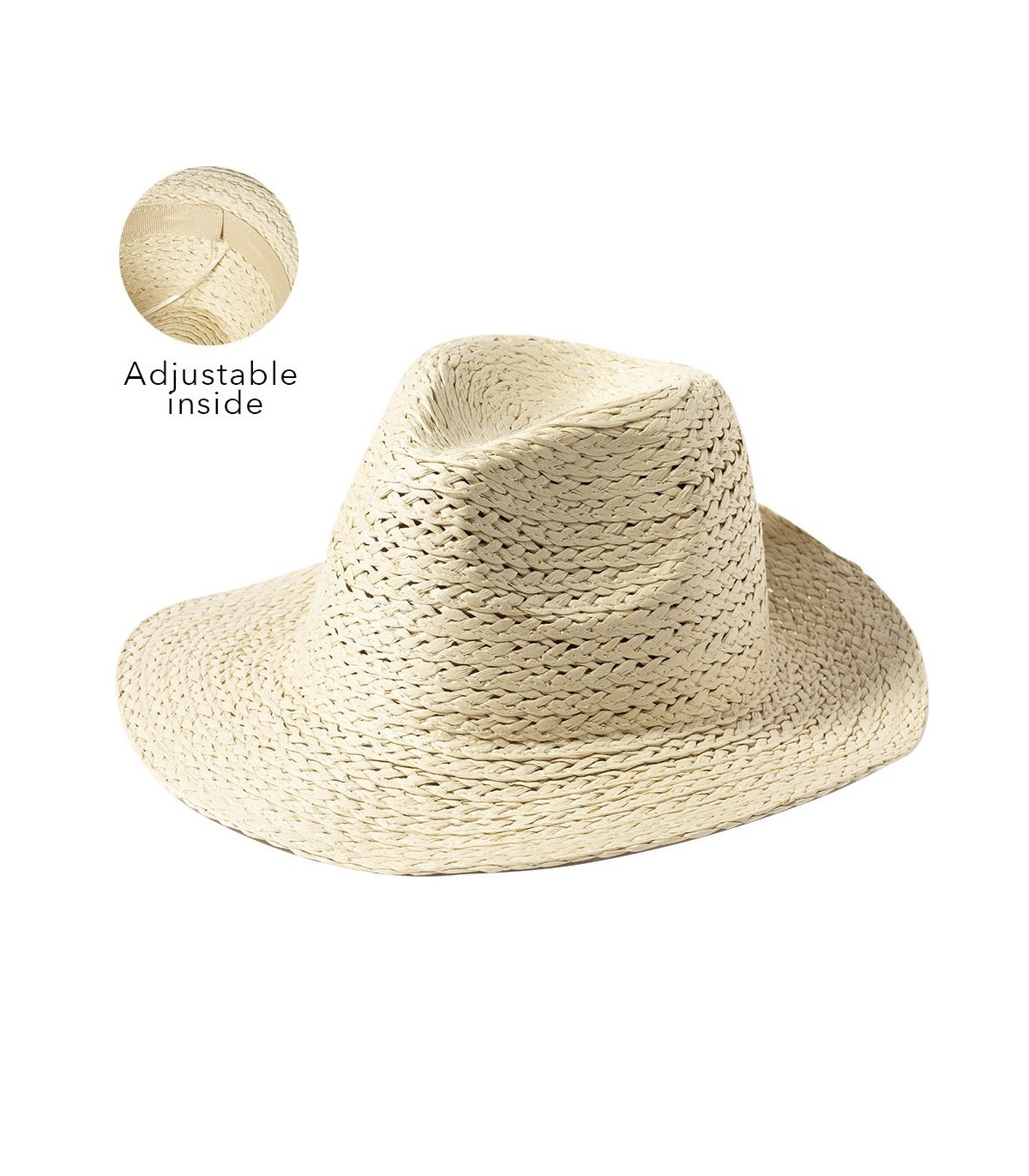 Sombrero de alta calidad en material sintético y acabado natural. Ajustable desde el interior y con confortable cinta interior a juego.
