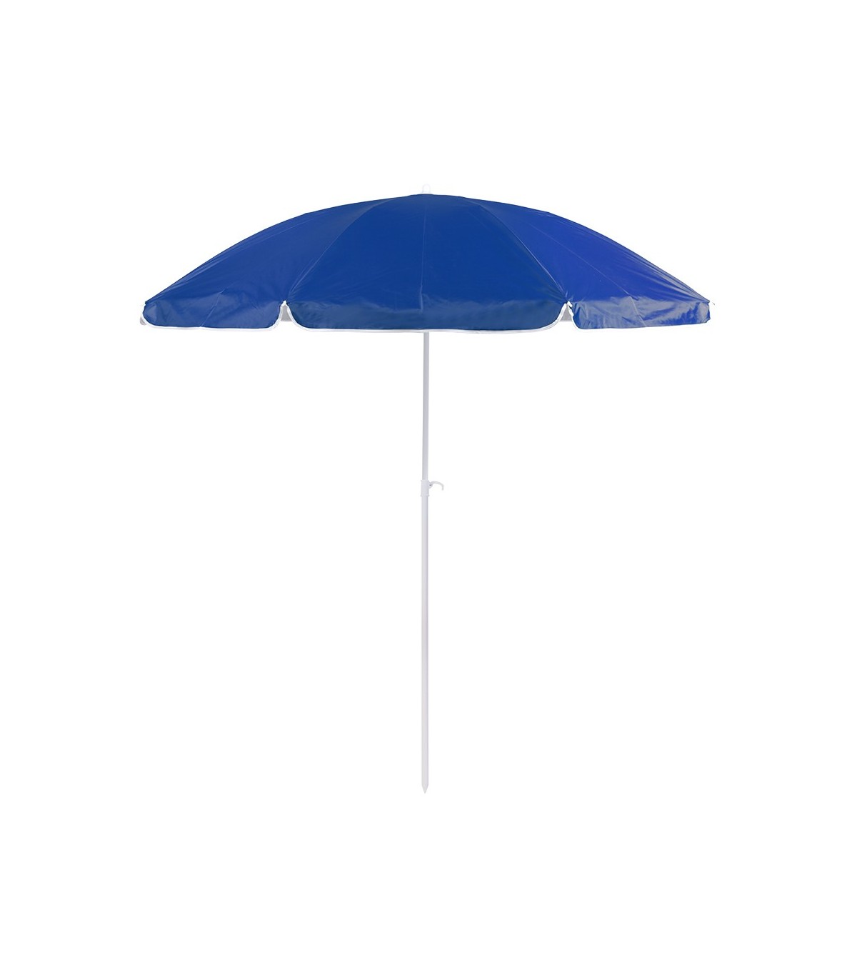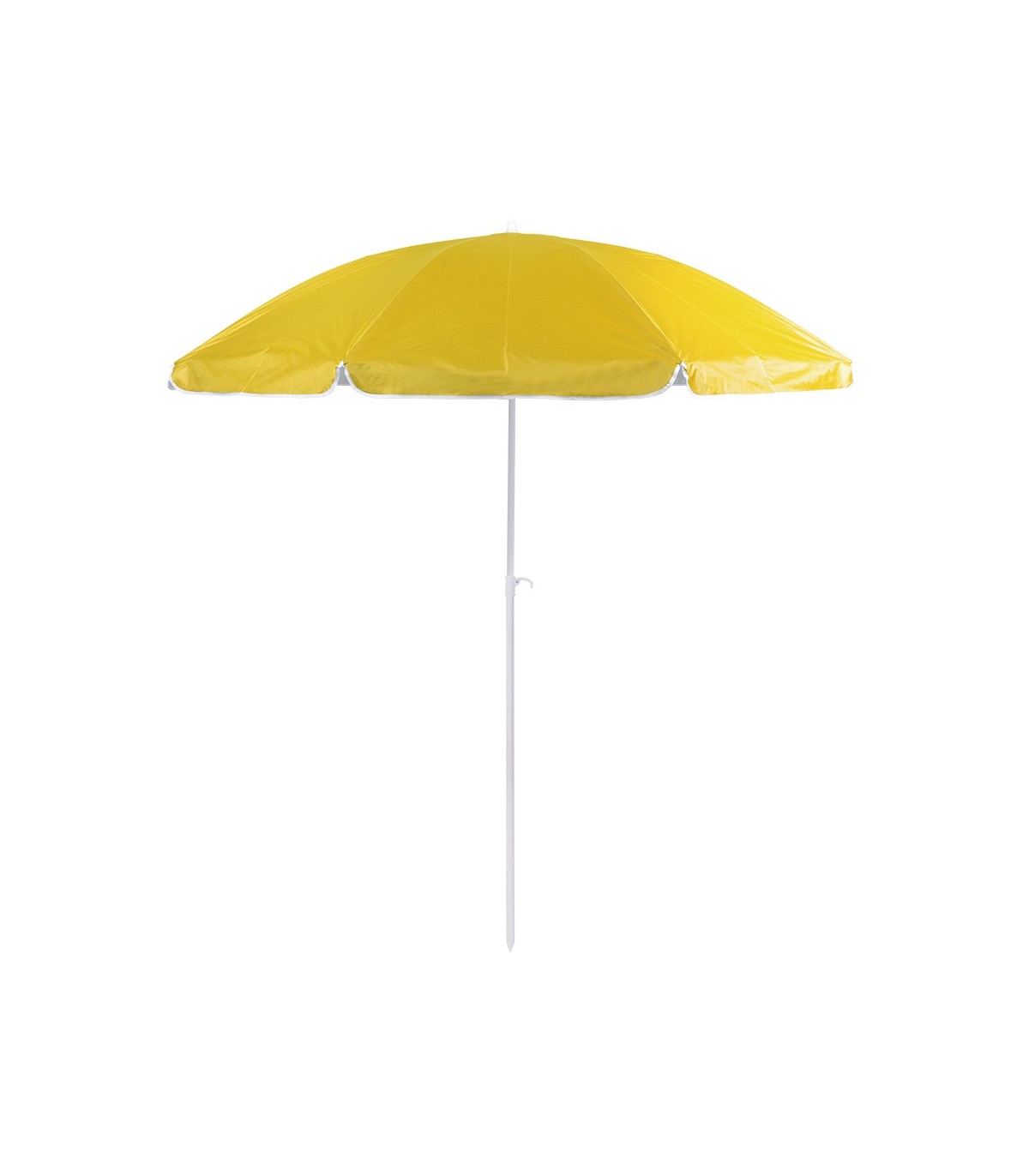 Sombrilla de playa de 8 paneles en resistente nylon. Interior en color gris plateado con protección UV, con tubo telescópico inclinable y ajustable en altura. 200cm de diámetro, con faldones laterales ribeteados, tubos metalizados en color blanco y disponible en una amplia gama de colores. Presentada en funda de nylon con cinta de transporte para hombro.