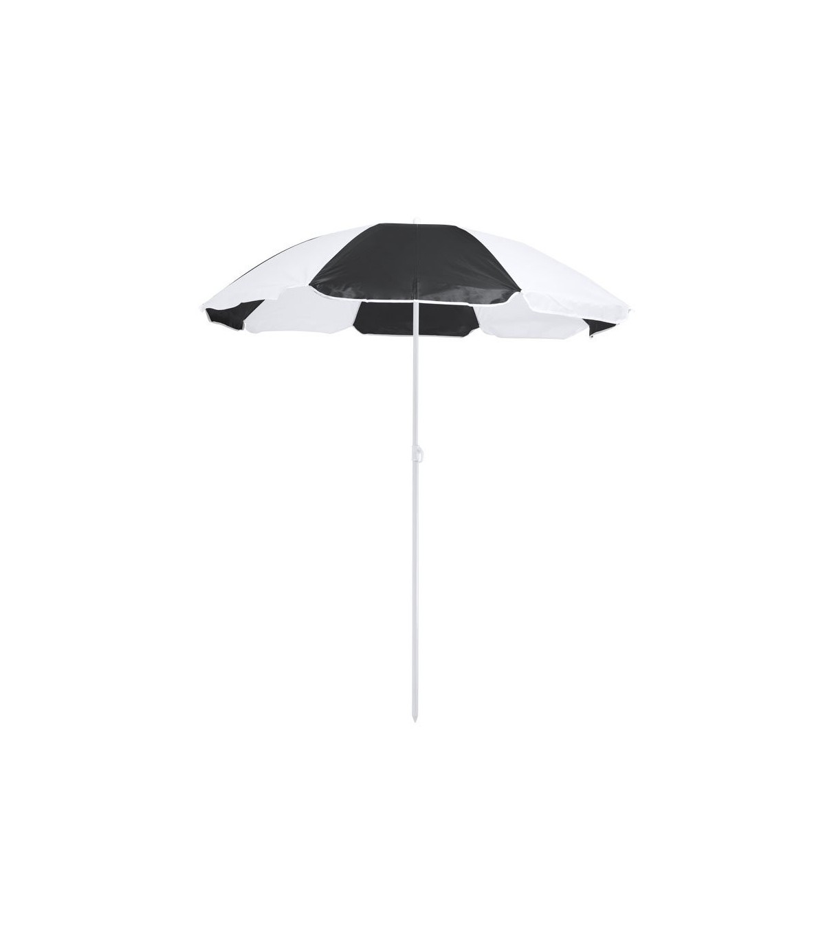 Sombrilla de playa de 8 paneles en resistente nylon de combinación bicolor. De 150cm de diámetro, con faldones laterales ribeteados, tubos metalizados en color blanco y ajustable en altura. Presentada en funda de PVC con cinta de transporte para hombro. Disponible en variada gama de colores combinados.