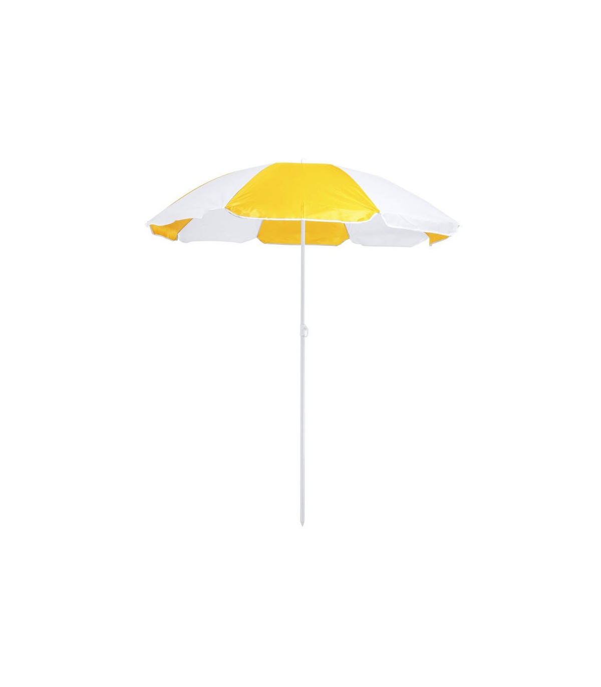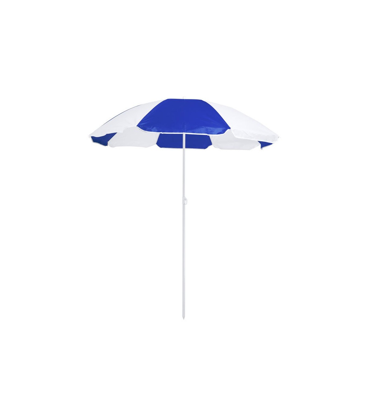 Sombrilla de playa de 8 paneles paneles y 150cm de diámetro, con faldones laterales ribeteados, tubos metalizados en color blanco y ajustable en altura.