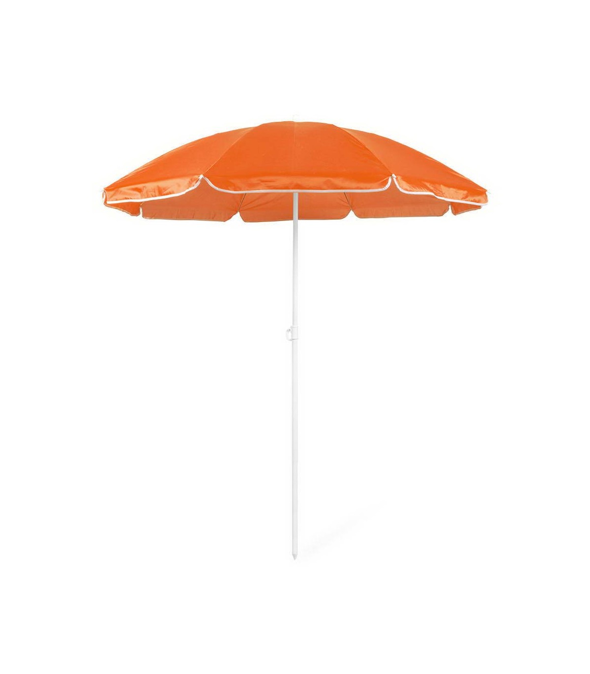 Sombrilla de playa de 8 paneles de resistente nylon en variada gama de vivos colores. De 150cm de diámetro, con faldones laterales ribeteados, tubos metalizados en color blanco y ajustable en altura. Presentada en funda de PVC con cinta de transporte para hombro.