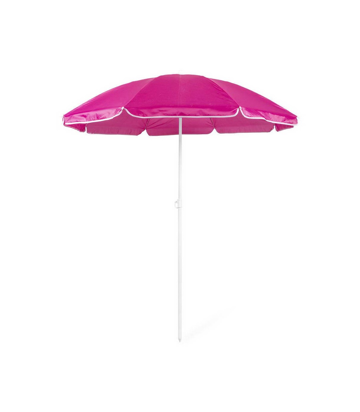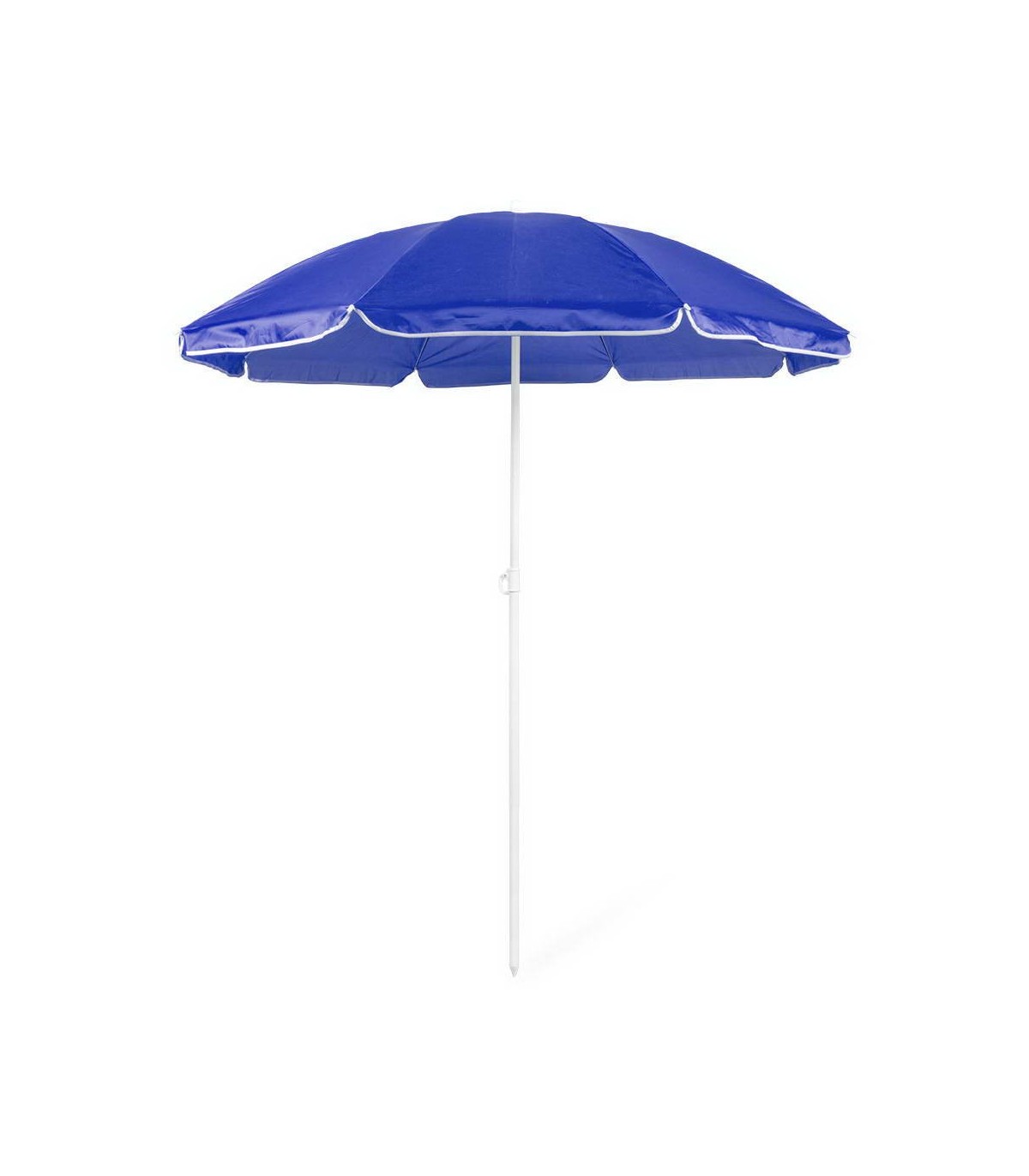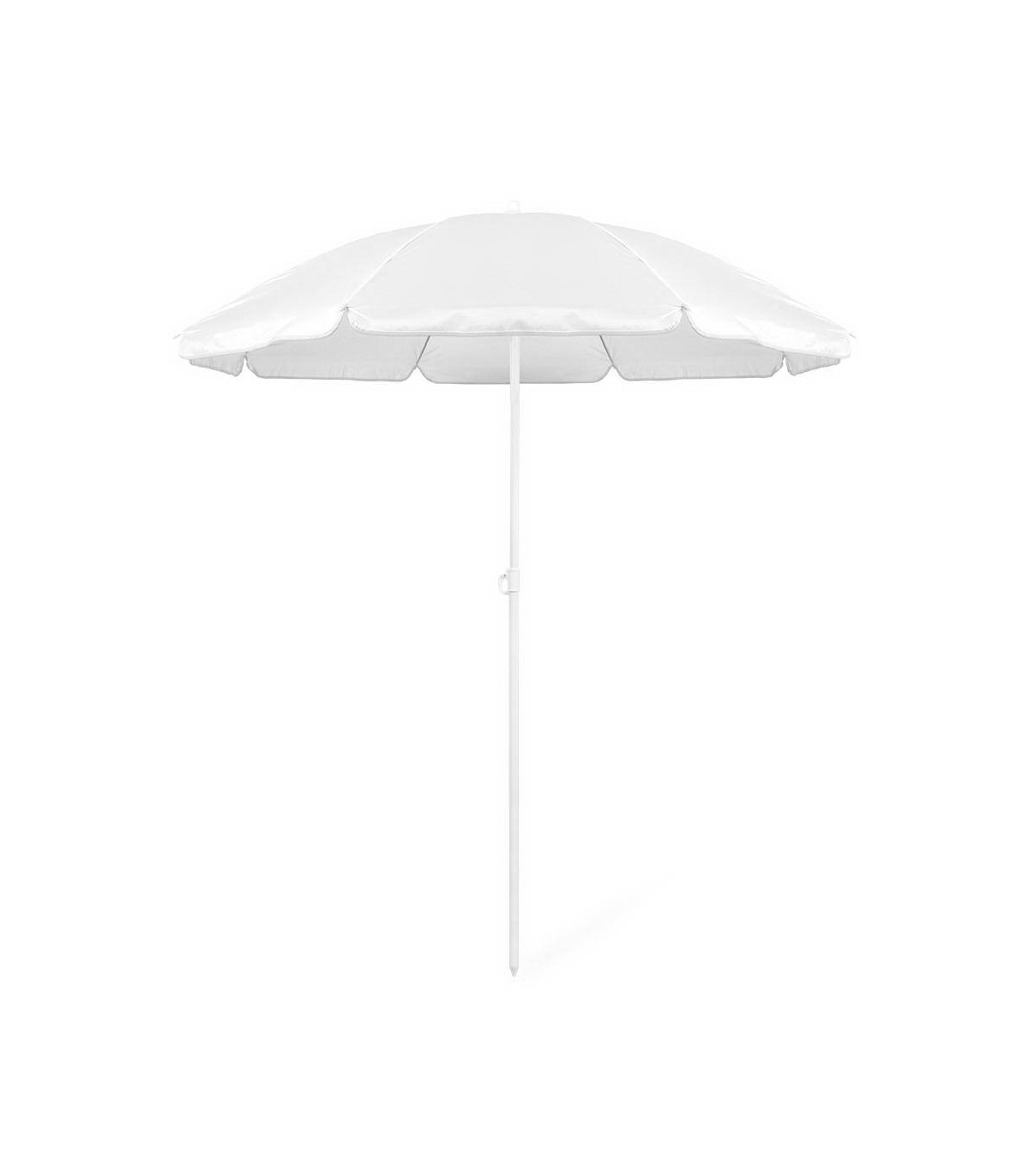 Sombrilla de playa en nylon. De 150cm de diámetro, con faldones laterales ribeteados, tubos metalizados en color blanco y ajustable en altura. Con cinta de transporte.