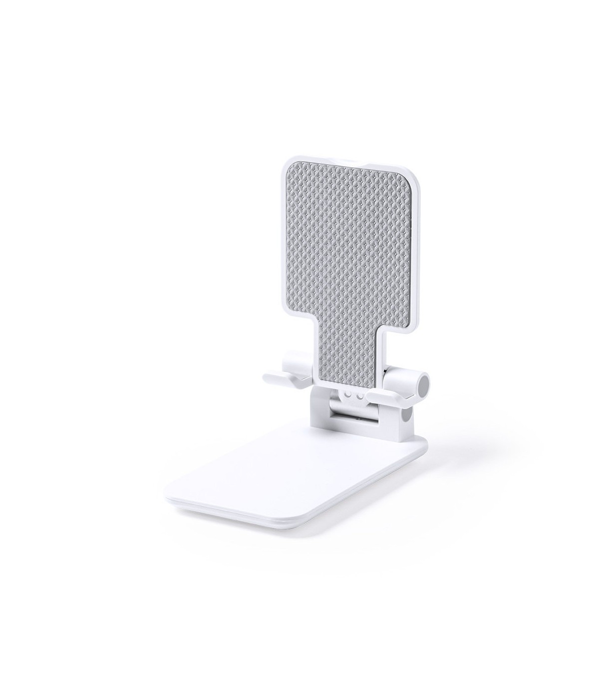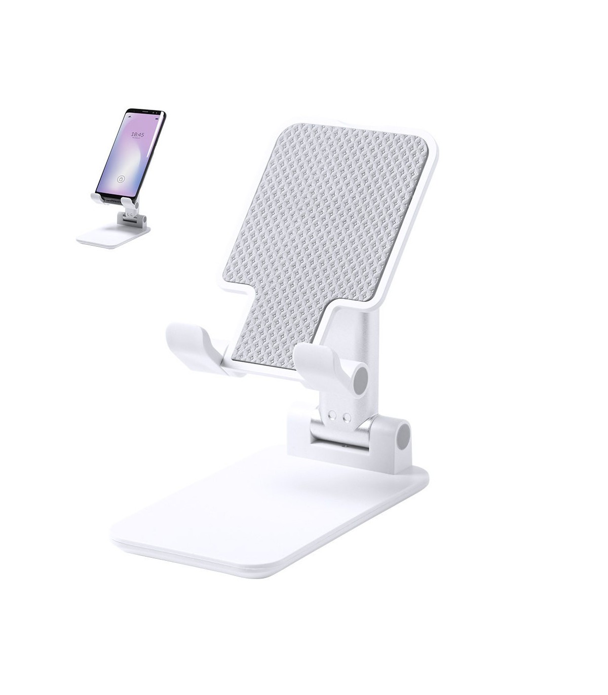 Soporte plegable para smartphones y tablets. Regulable en altura, incluye protecciones de goma antideslizantes en base y soporte. En sobrio acabado de color blanco y con amplia superficie de marcaje, especialmente indicado para impresión en tampografía. Presentado en atractiva caja de diseño.