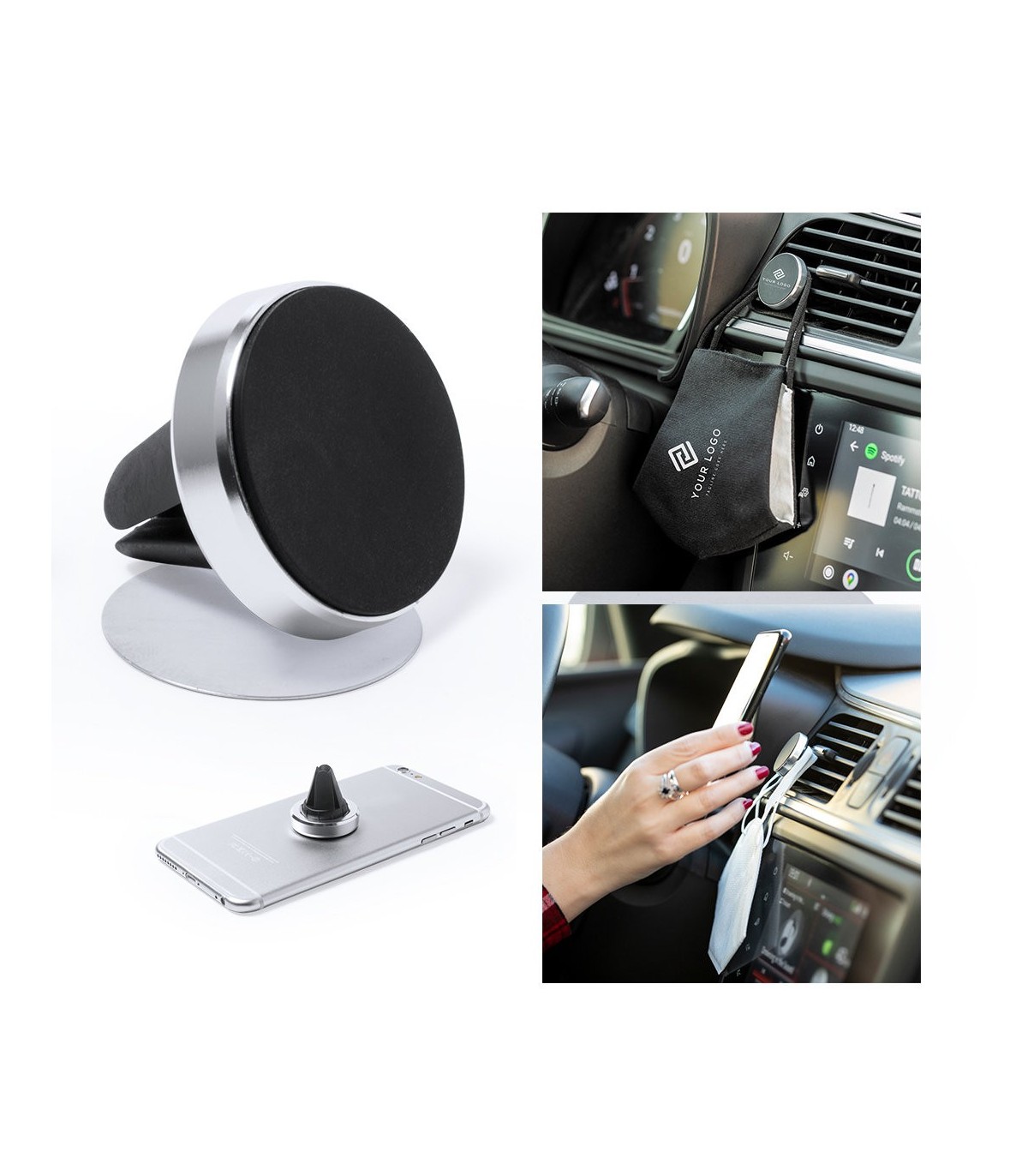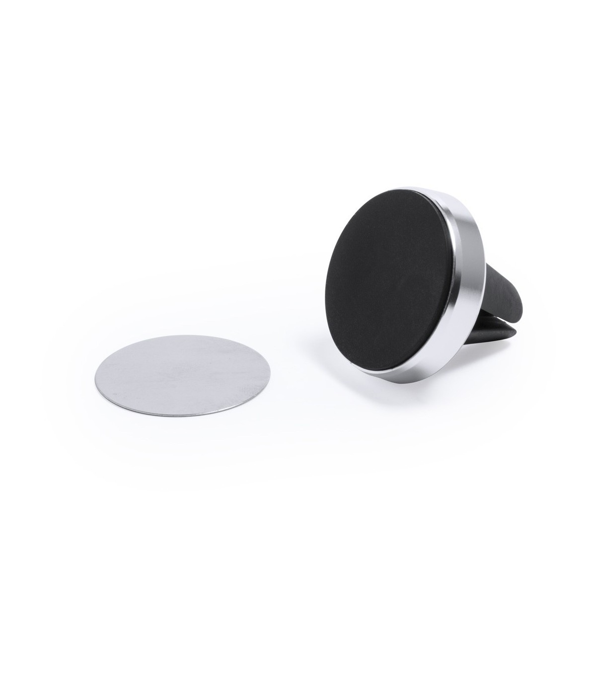 Soporte magnético para smartphone de diseño minimalista y elegante acabado en aluminio. Con sistema de fijación para rejilla de ventilación del automóvil y pastilla circular frontal especialmente diseñada para marcaje en tampografía.
