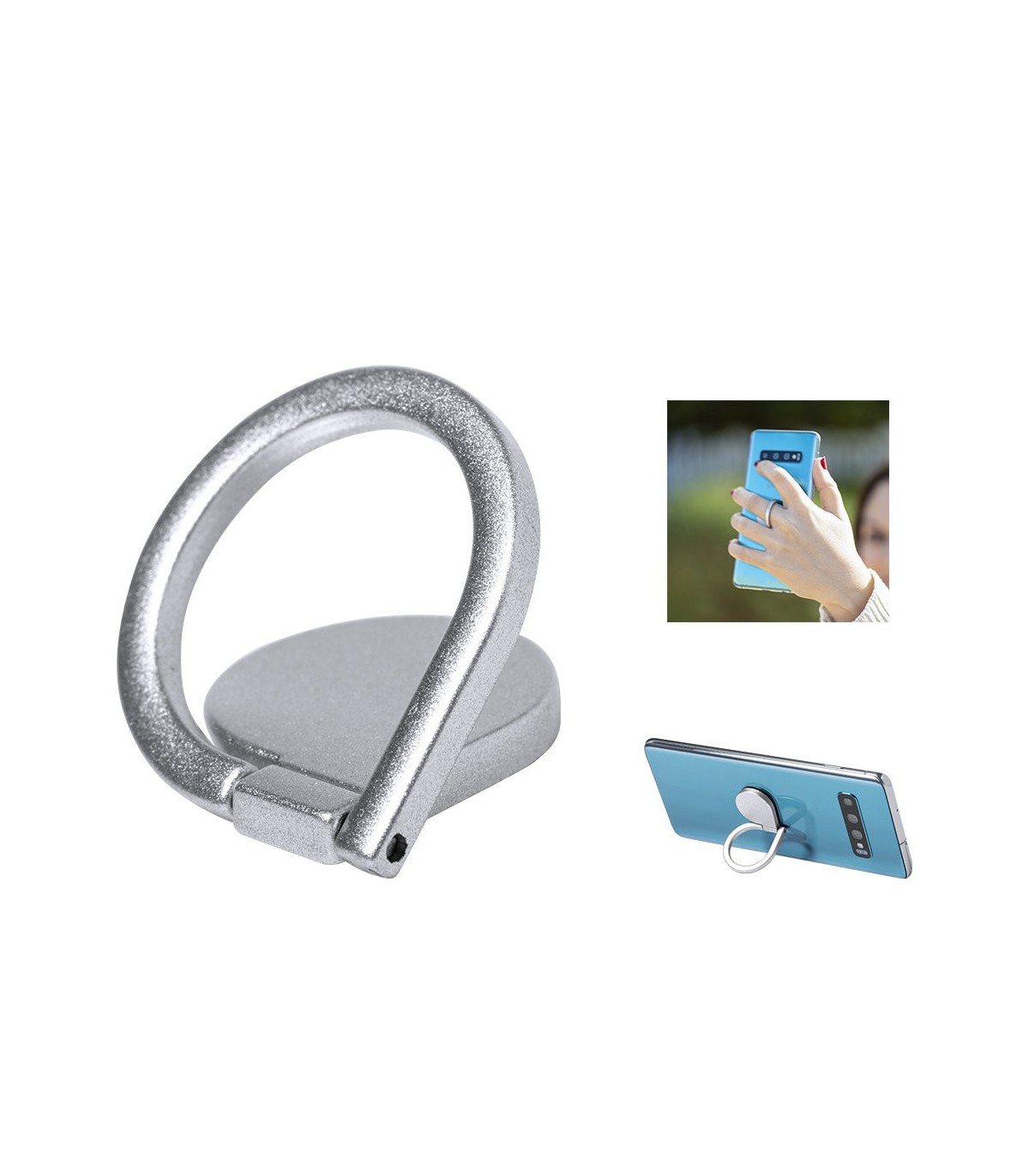 Soporte metálico para smartphone en acabado mate. De elegante diseño y con adhesivo 3M, de fijación extra fuerte y libre de residuos al despegarlo del dispositivo. Con anilla soporte posterior para dedo y presentado en bolsita individual de diseño.