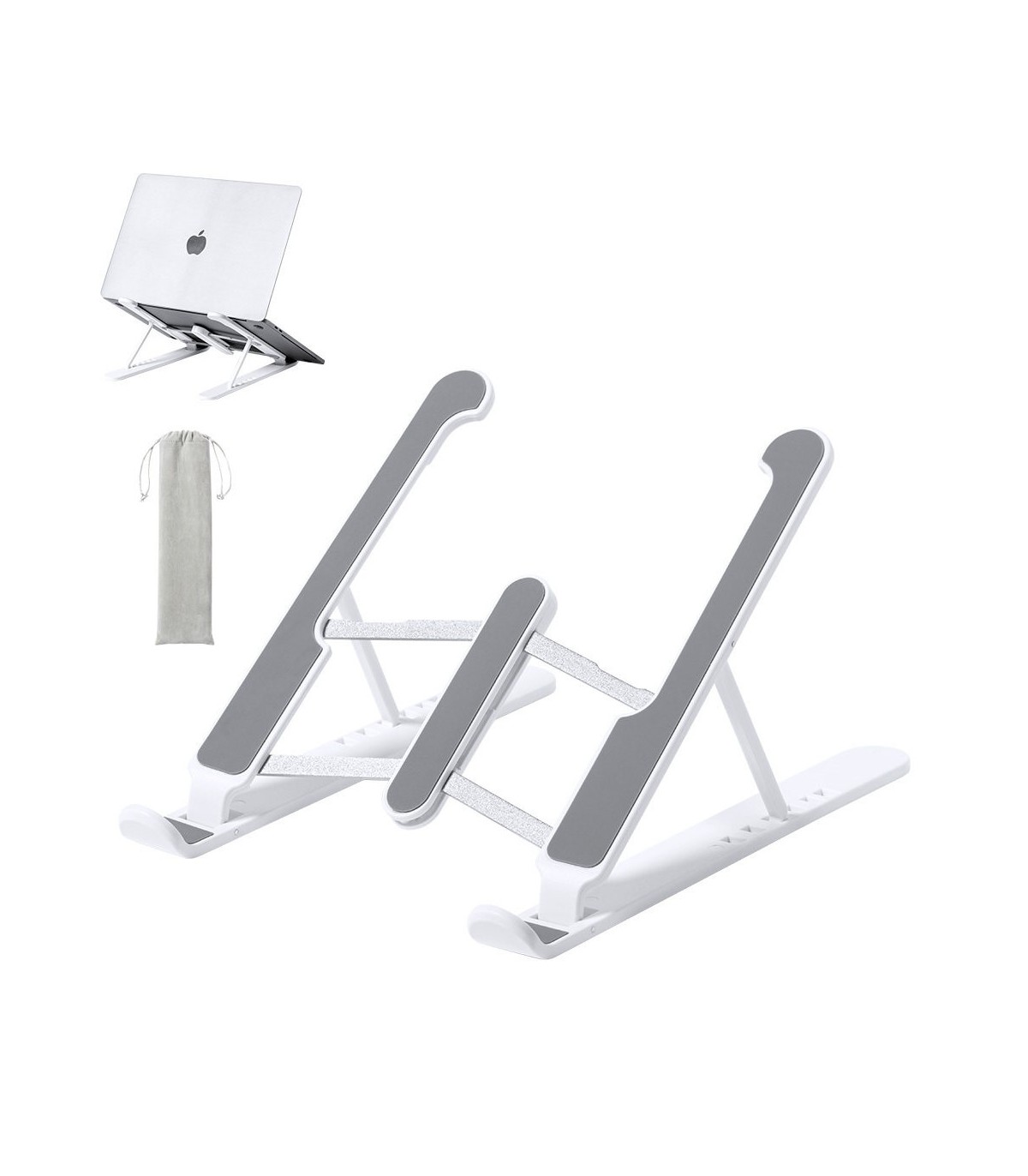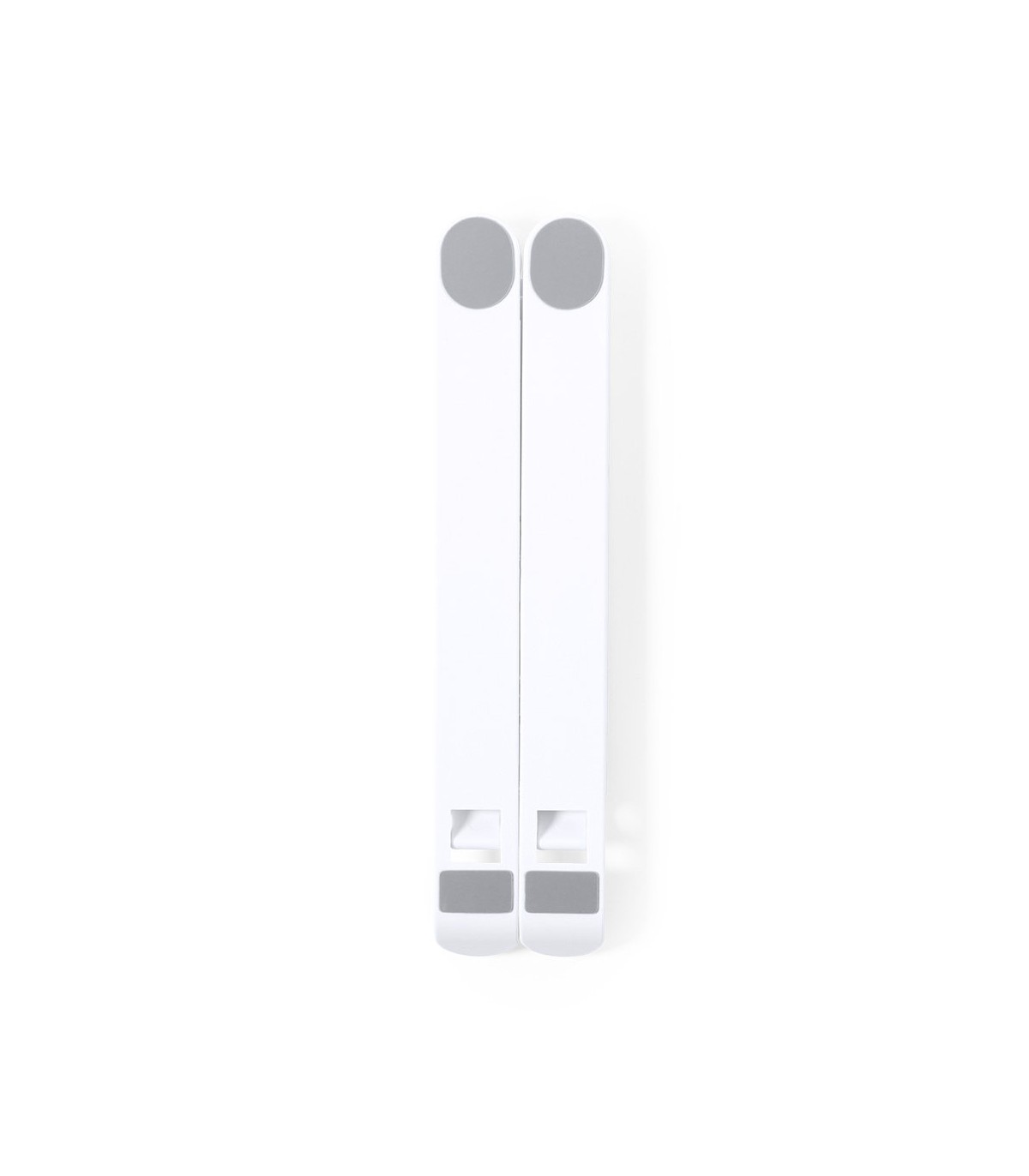 Soporte plegable para portátil. Fabricado en resistente ABS con protecciones antideslizantes en TPR para un firme ajuste al dispositivo. Regulable en altura, con plegado de tamaño compacto y presentado en funda de antelina con cierre de cordón y en caja individual de diseño.
