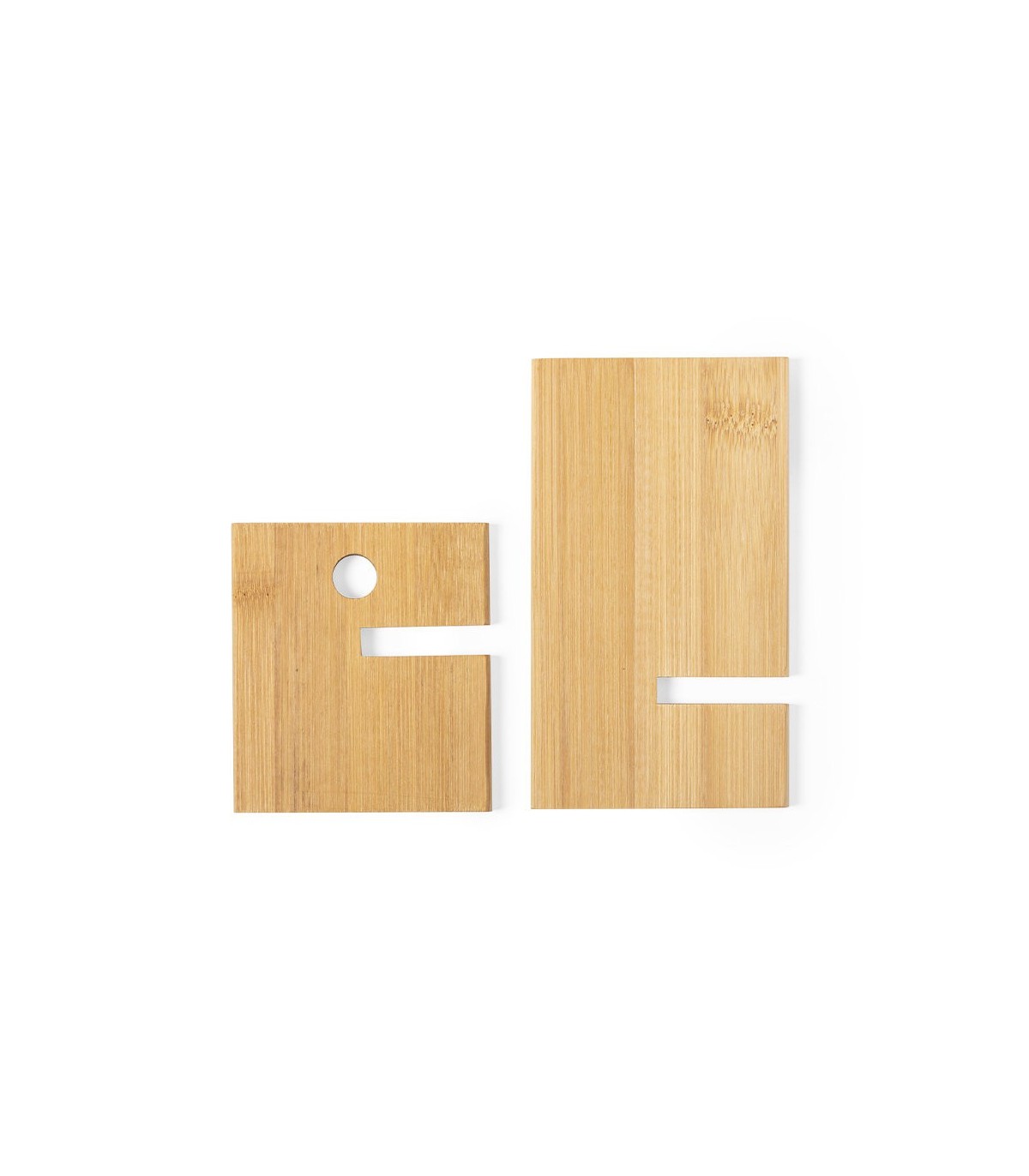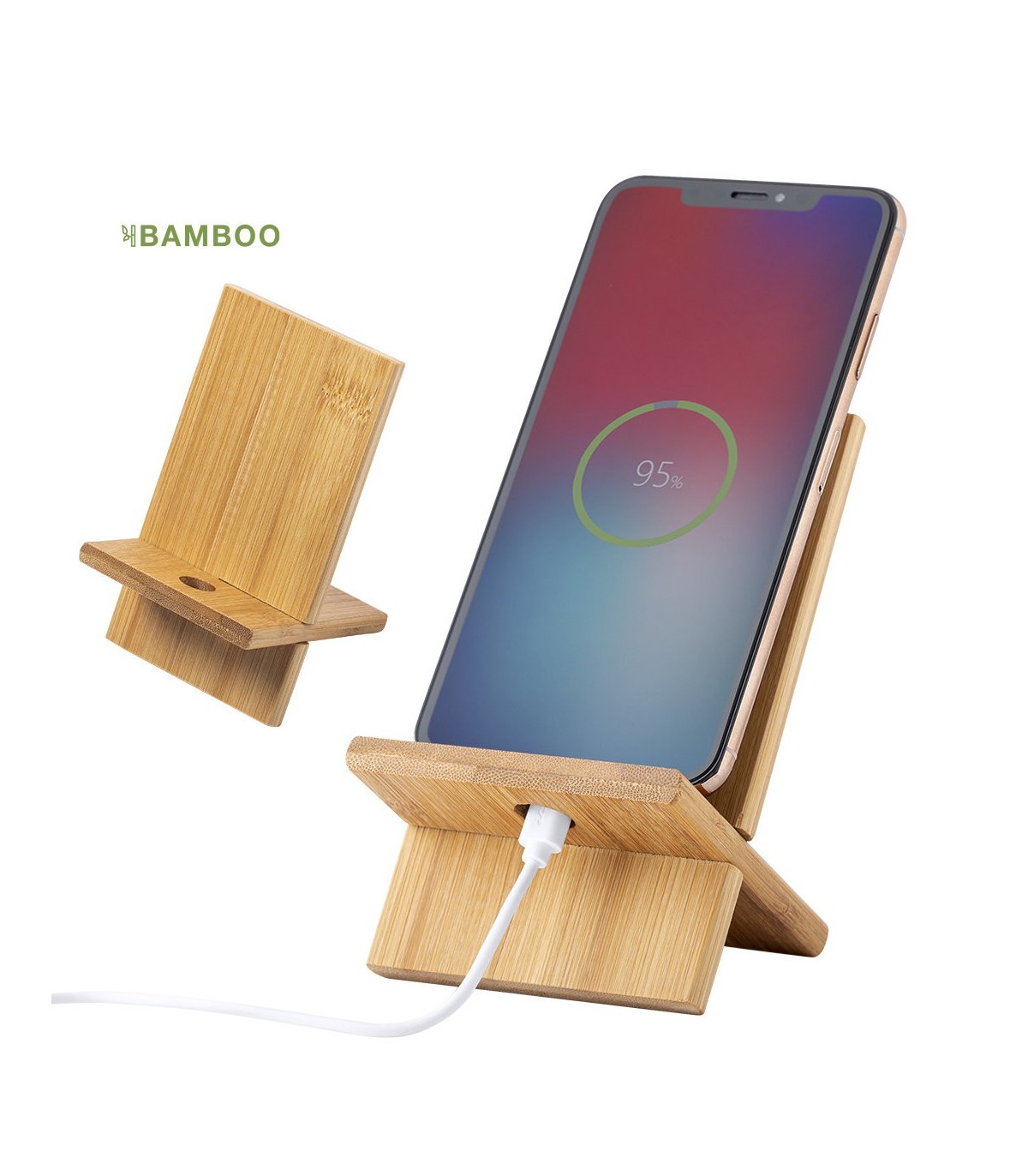 Soportes de móvil fabricado en bambú, con ranura para cargar el móvil y que no estorbe el cable, muy originales para regalar con tu logo impreso como articulo promocional.