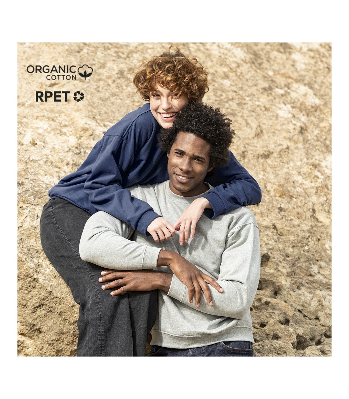 Sudaderas personalizadas para adulto unisex ecologicas de algodón orgánico peinado y poliéster RPET, de 280g/m². Cuello, puños y cintura de punto canalé 2x1, hombros con costura.