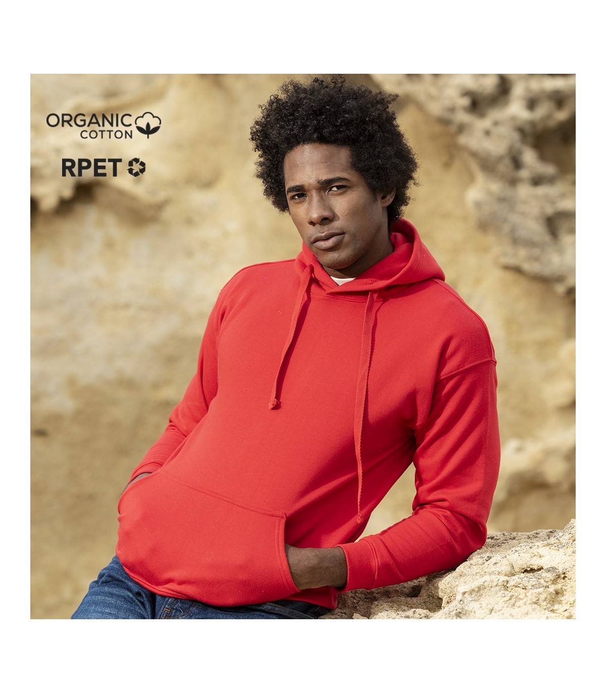 Sudadera para adulto unisex con capucha. Fabricada en combinación de materiales algodón orgánico peinado y poliéster RPET de 280gsm. Bolsillo canguro y capucha forrada de punto liso, con cordones a juego. Cuello, puños y cintura de punto canalé 2x1, hombros con costura. Con etiqueta distintiva eco. Con certificación GOTS (Global Organic Textile Standard) y GRS (Global Recycled Standard) que acreditan el origen eco-friendly del material utilizado en la fabricación del producto. Disponible en diferentes colores para personalizar.