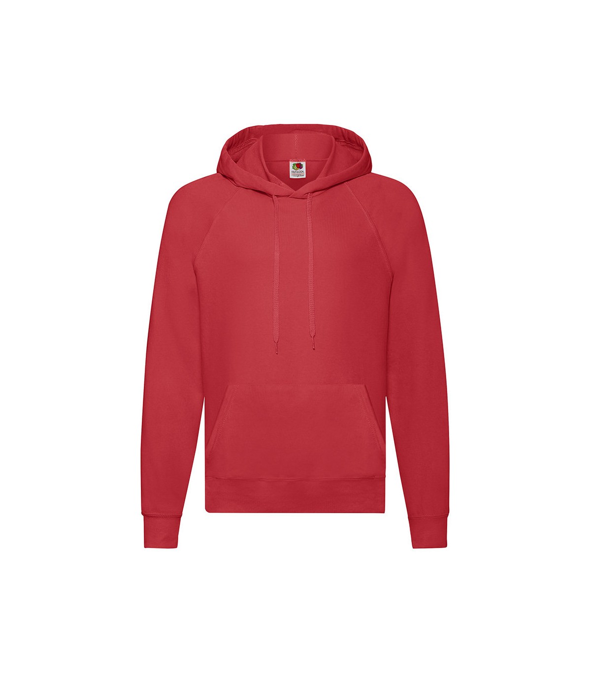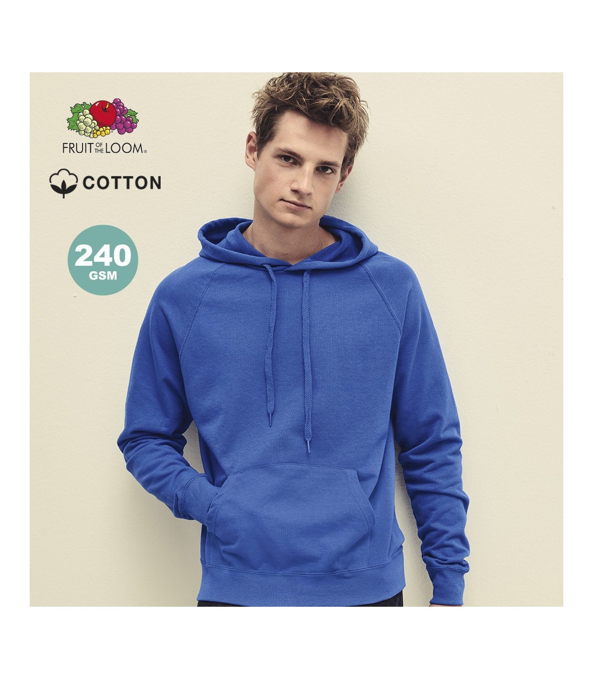 Sudadera para adulto Lightweight Hooded Sweat de Fruit Of The Loom con capucha y cordón plano de ajuste a juego. Fabricada en felpa ligera sin cepillar, en combinación de materiales 80% algodón + 20% poliéster de 240g/m2. Con manga raglán. Bolsillo frontal tipo canguro, con cintura y puños en algodón/ LYCRA®. Disponible en diferentes colores para personalizar y en tallas S, M, L, XL, XXL.