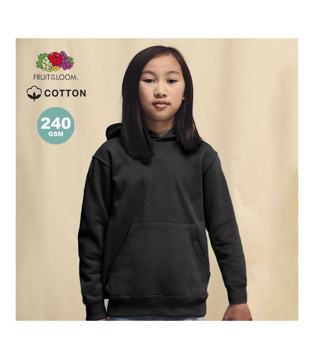 Sudadera unisex para niños Lightweight Hooded Sweat de Fruit Of The Loom. Fabricada en felpa sin cepillar, en combinación de materiales 80% algodón + 20% poliéster de 240g/m2. Capucha sin cordón de ajuste para garantizar la seguridad de los niños y en cumplimiento con la legislación europea de ropa infantil. Manga ranglán y bolsillo frontal tipo canguro, con cintura y puños en algodón/ LYCRA®. Disponible en diferentes colores para personalizar y en tallas 5-6, 7-8, 9-11, 12-13, 14-15.