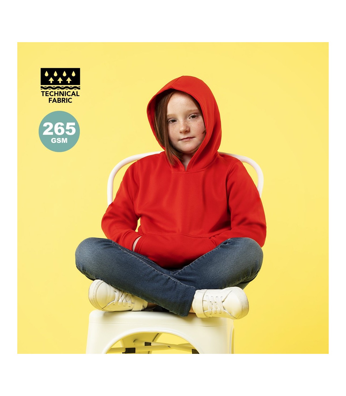 Sudadera técnica para niño unisex. Con capucha, cintas de ajuste, bolsillo tapete frontal y en material 100% poliéster de 265g/m². Disponible en originales colores para imprimir con tu diseño. Tallas 4-5, 6-8, 10-12.